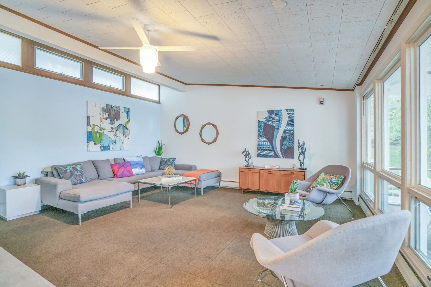 The three-bed, three-bath mid-century modern home, which was built in 1955, is set on on 200 feet of prime lakefront, and boasts an incredible contemporary design that retro enthusiasts will go for. The roomy kitchen embraces the mid-century time period, and has a center island with bar seating, as well as a dining area for family gatherings. Continue on into the living room, where a white brick fireplace with wooden features embraces the mid-century vibe, and oversized windows stream in natural light from the waterfront. On the lower level, a huge family room offers a variety of spaces to hang out, whether in front of the TV or in the den-style area. Each bedroom has big windows that show off the natural beauty outside. An open-air porch offers a cozy nook, while the expansive patio provides an excellent space for entertaining guests and enjoying the bucolic environment.