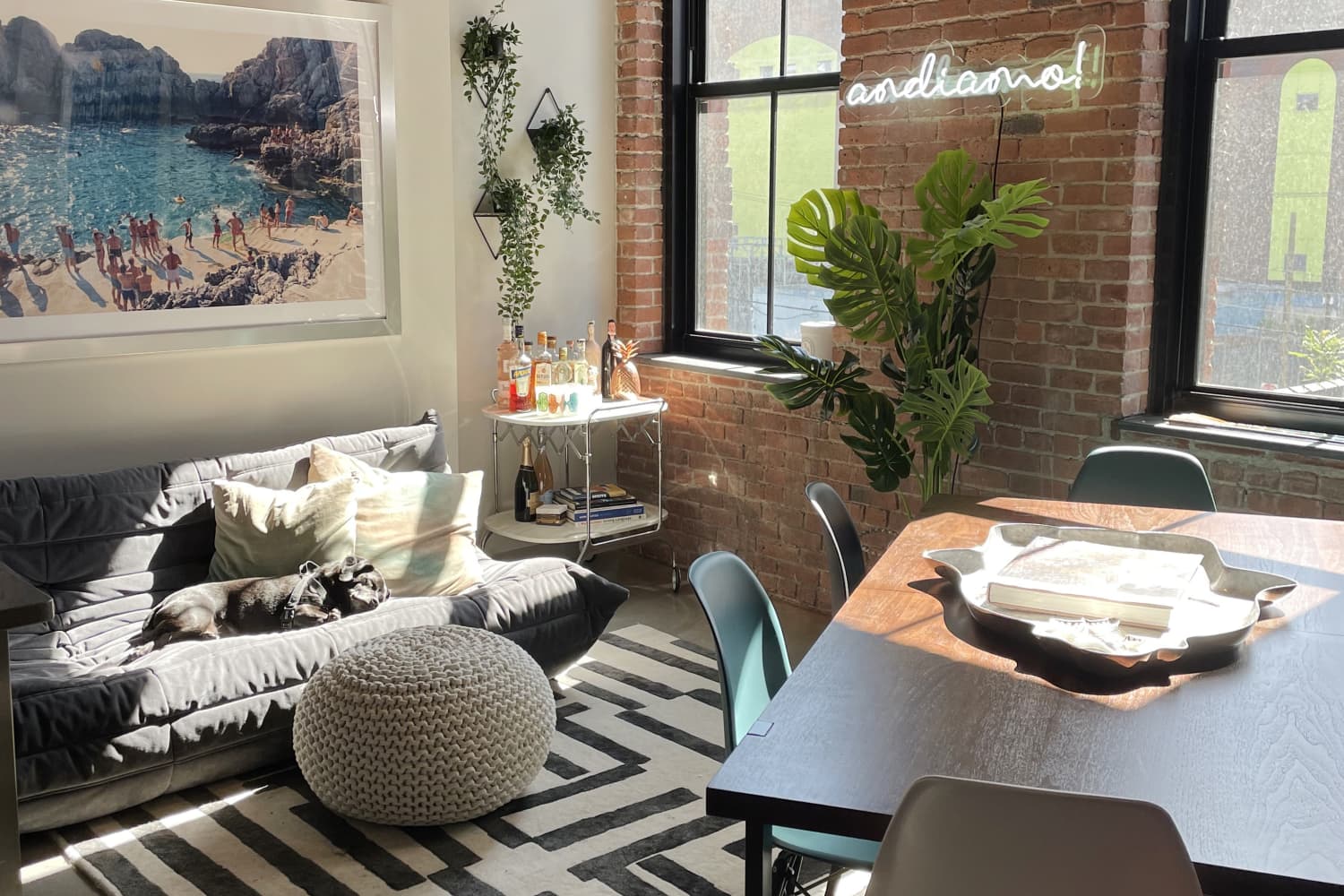 Tell us a little (or a lot) about your home and the people who live there: I’ve always loved the look and feel of old industrial buildings and converted lofts compared to the soulless, pristine white box options you typically find in rental buildings in and around the city. I recently moved from a loft building in Brooklyn, and was looking for something with similar character (exposed brick and beams, and good natural light). I found it here, in a converted warehouse building in Jersey City. Prior to the pandemic, I worked in hospitality. When my clients shut down in March 2020, I spent many months alone with my rescue pup on what I came to realize was a very uncomfortable couch. I needed a change (and more closet space for a fledgling business making baby denim jackets during my months at home).