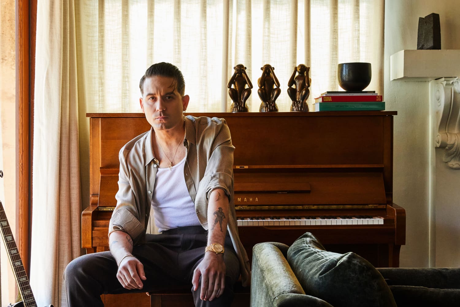 Filled with musical instruments and equipment, the home has vaulted beamed ceilings that G said “originally sold me on this house.” However, he admitted they basically redid most of the space, filling it with unique details that create a lived-in space. The living room, which is filled with original artwork, is anchored by a custom gray sectional sofa and chairs, with walnut and brass sconces featured throughout the home. There’s a floating rectangular bamboo coffee table and vintage hand-knotted carpet, as well as a piano that sits near a window. There’s shelves of books and “older, traditional rugs” that G enjoyed throughout the quarantine period, when he was at home way more than usual.
