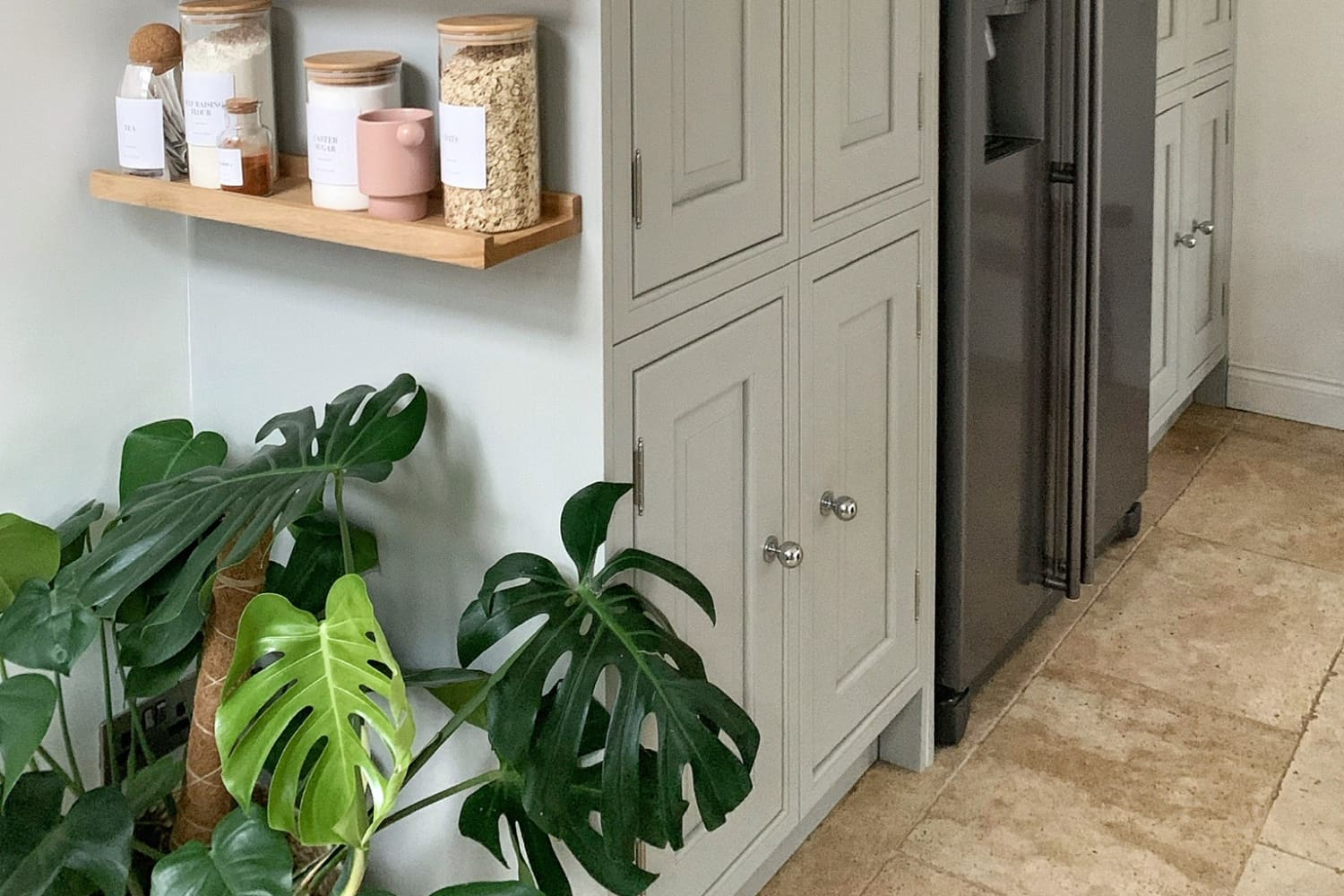 You can use any small corner to install floating shelves, as Imogen did in her kitchen. Just fill pretty jars with your essentials so they double as décor.