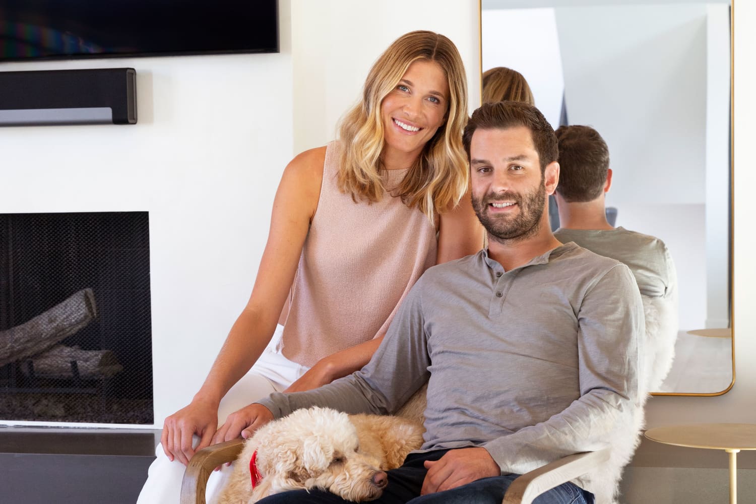 The couple turned to interior design duo Lori Teacher and Monique Blum of Lo + Mo Design to cultivate a home that fit the lives of two extremely active people who love to enjoy their downtime. Like most pro athletes, Klineman fuels her body in the kitchen, and knew creating a functional kitchen “was a really huge focus.” They filled the room with dark-colored cabinetry and white marbleized countertops, as well as a separate bar area next to the kitchen, since Klineman wanted the space to have room for “everyone to coexist without stepping on each other’s toes.”