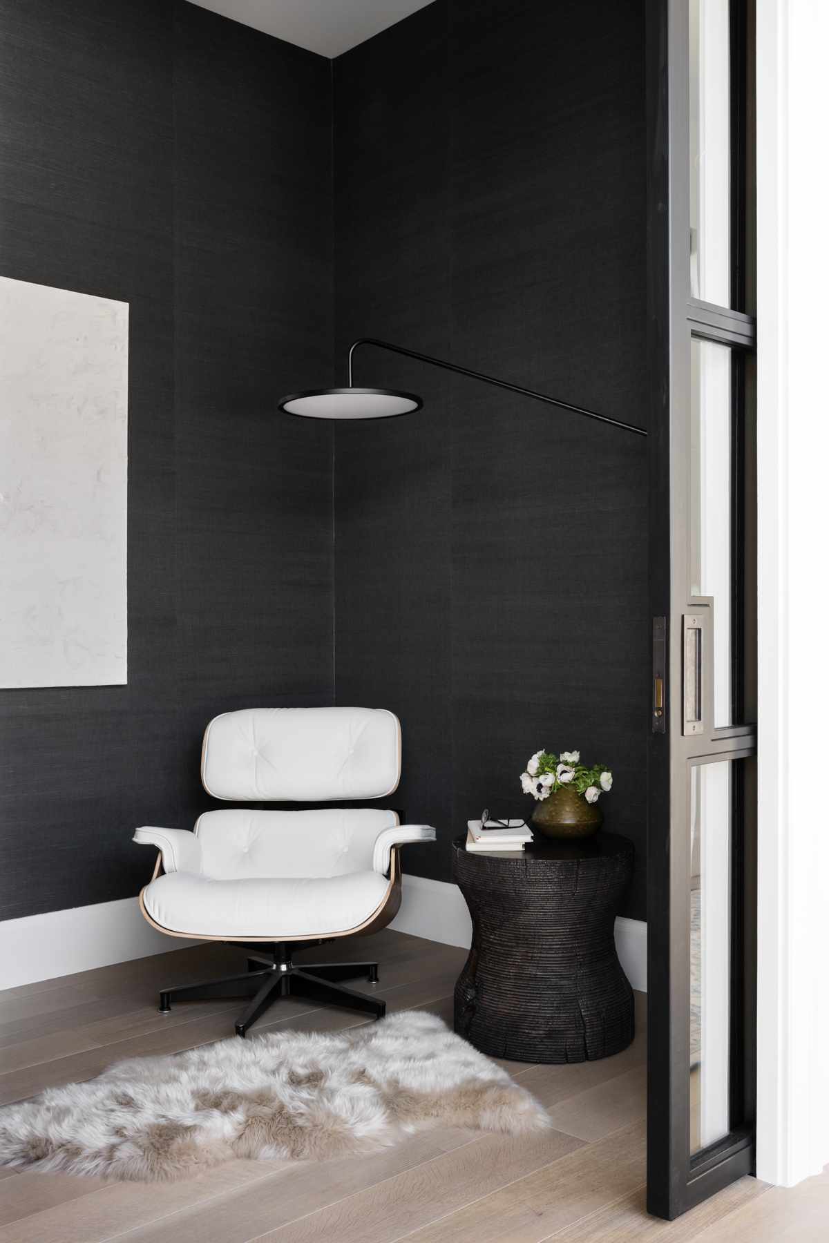 Dark grass-cloth wallpaper complements the dark-stained built-ins, and is contrasted by abstract artwork, a white Eames chair in the corner, and a few of our favorite décor pieces.