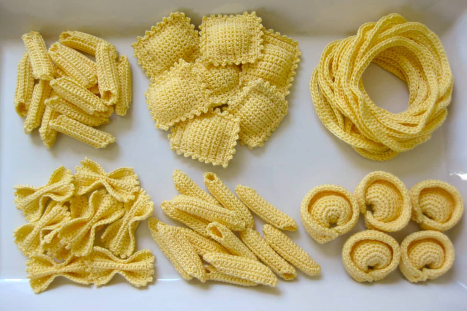 Ablao shares an extensive archive of patterns on her Etsy shop, the most popular being the “Pasta Party Crochet Pattern” ($7.80) which includes farfalle (bow-tie), fettuccine, penne (smooth), penne rigate (furrowed), ravioli, and tortellini.