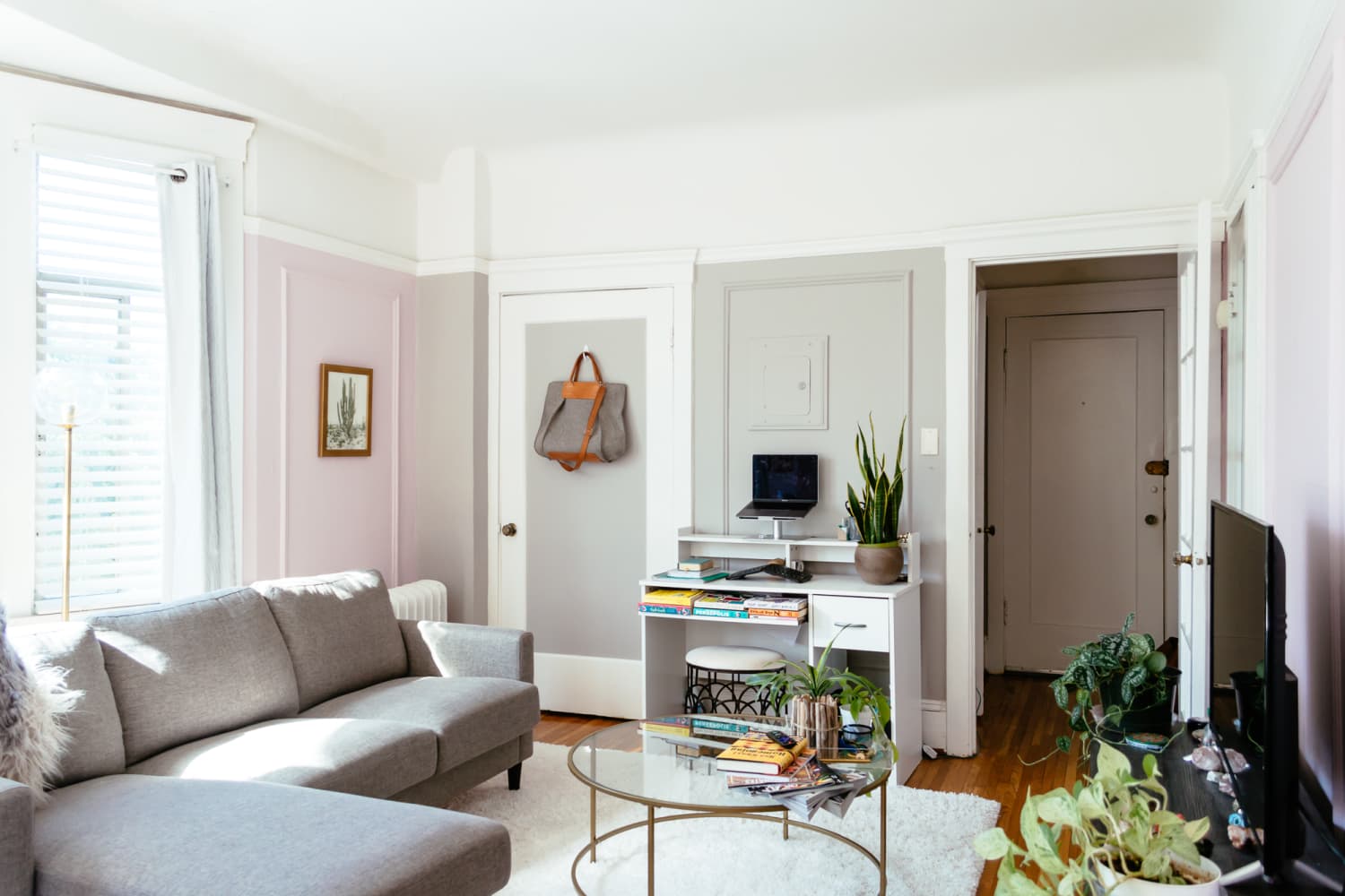 Clear tables give the illusion of more square footage. “They have the ability to open up the space because of their airy and transparent appearance — allowing you to see the flooring so the room appears more spacious than with a solid surface coffee table that cuts out some of the visual floor space,” explain Amy Monroe and Katie Knitter with interior staging and styling service Becoming Home.