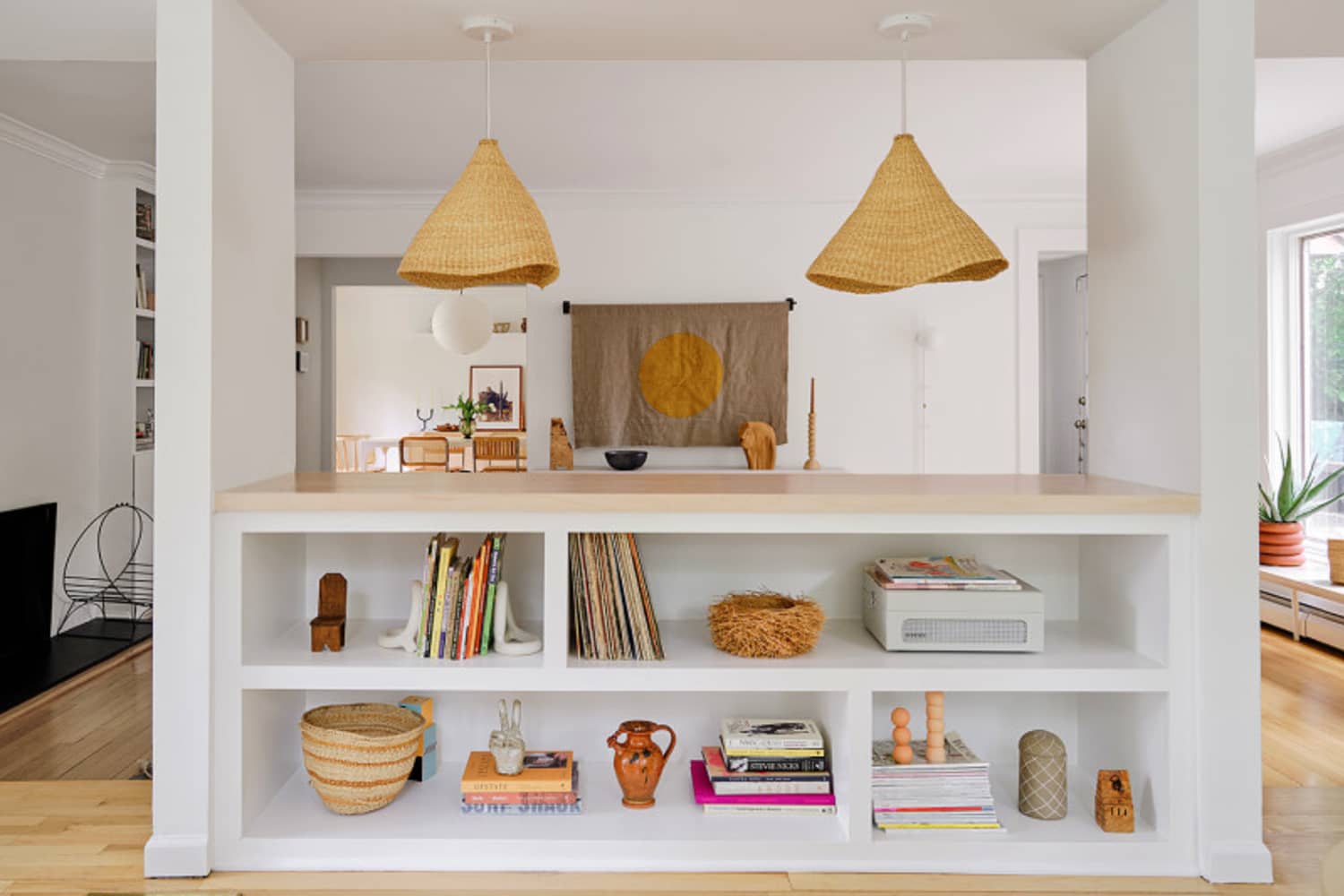Velten-Lattrell commissioned artist Janelle Pietrzak from All Roads Design to create the textile, which is fairly simple and resembles a sun, echoing the circular Etsy pulls on the IKEA console below it. The hanging hardware here is custom, but the tapestry essentially is mounted like a curtain. You can commission a TV cover from any artist you admire, but if you’re working with a tight budget, you can also try to DIY a TV tapestry yourself.