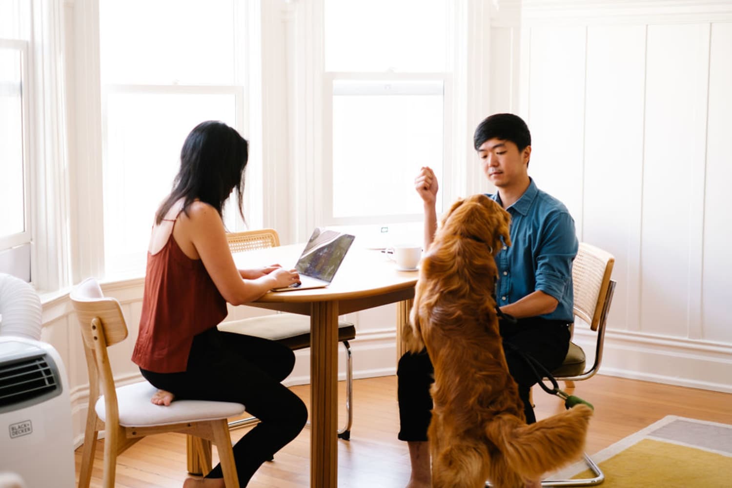 Dog crates are an important part of an apartment pup’s training and well-being. They’re practical and strong. Problem: They’re also pretty bulky, and ugly. To fix this, we purchased an IKEA solid wood countertop and got a TaskRabbit’s help to laser-cut and sand it down to size. Then, we leaned a vintage brass-gilded mirror on the top, secured to the crown molding with eyelet hooks and cable ties, safely out of sight, and staged loved objects amid the dog equipment and treats. This is just one of the things we did to dog-proof the house without compromising on spaciousness or aesthetics. And now we have an extra table/dog station/surface on which to forget we left our phones.