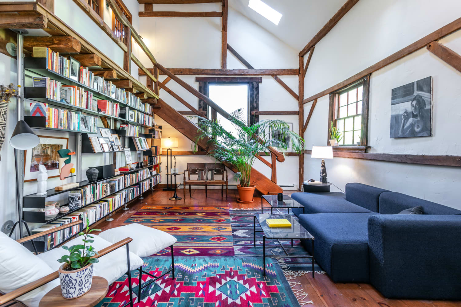 First, the home measures 3,600 square feet. That’s a lot of former dairy storage turned into living space: one airy living area, for example, boasts a wall of bookshelves, a wood stove, and an open staircase to the second level. Elsewhere, you’ll find more cathedral ceilings, skylights, and plenty of exposed posts and beams. The barn’s converted silo, meanwhile, has been outfitted with a home gym and office. What better way to separate work life from home life than a literal silo?