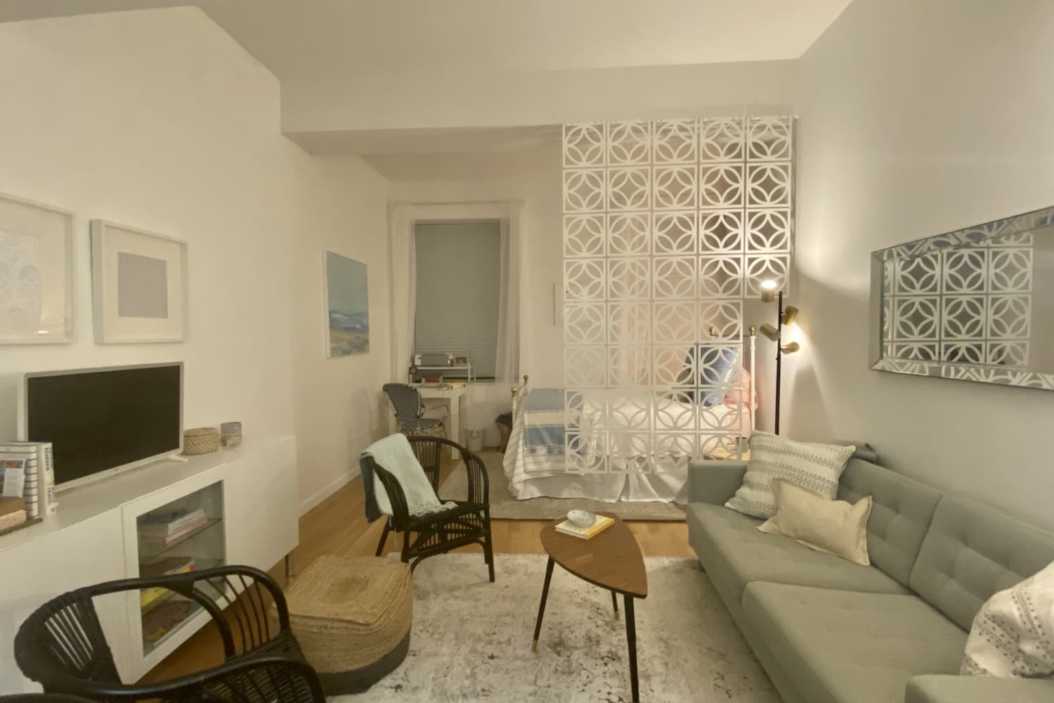 One standout feature (and photo) from her studio that I keep coming back to? A genius block of modular wall dividers that she hung from the ceiling — with just Command Hooks, no less — to section off her bed from the living room area. I know, I know: Room dividers aren’t that revolutionary. Truthfully though, I’d never come across a small space solution IRL quite like this one before. And I’m not alone in my adoration: I showed a photo to the AT Style team, and they were instantly awed, too.