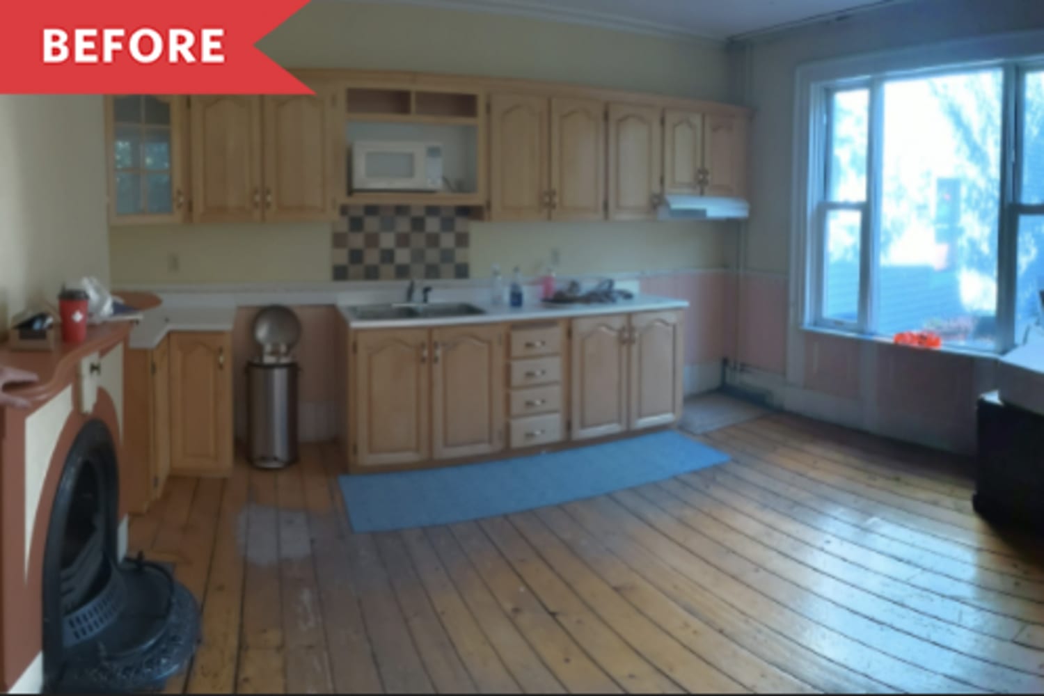 There was an odd patch of checkerboard backsplash above the sink, tons of yellowy oak cabinets, and dark, beat-up hardwood floors. Plus, the kitchen had an old coal-burning (!) fireplace that Sylvia just couldn’t figure out how to tie into her vision for the space.