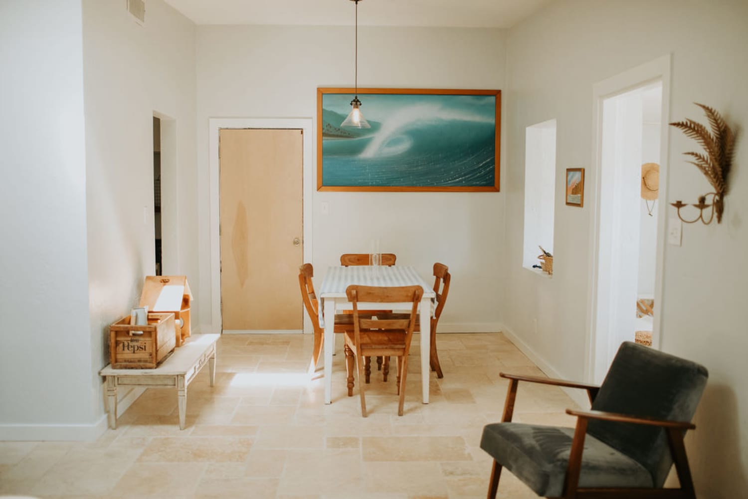 My husband has surfed since he was a boy and we are grandparents so that gives you a hint as to how long he’s been a water lover. Our identity is reflected on the walls and surfaces. We incorporated both local Florida artists along with many vintage finds from all over the US. We kept the palettes natural and light.