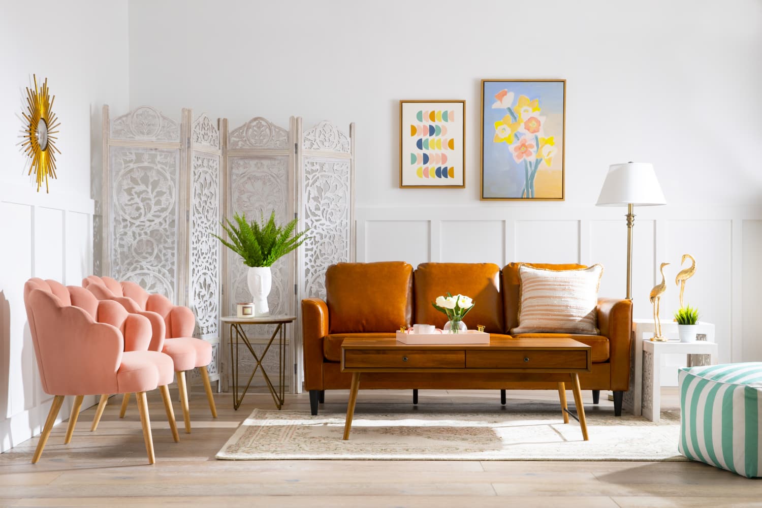 What makes Ashley’s room so interesting is the way she juxtaposes design elements. The sofa, coffee table, and wainscoting that make the room’s base are all hard angles, so she’s balanced them with soft lines with those proudly pink scalloped armchairs on the left and the flamingos mingling over on the right. At the same time, the brass lamp next to those flamingos “talks to” the gilded sunburst mirror across the room while those pink chairs form a sort of “pastel triangle” with the sea-green striped pouf and the wall art up top. (The two pieces here are “Simple Shapes in Soft Colors” [left] and “April Morning” [right], both from The Home Depot.)
