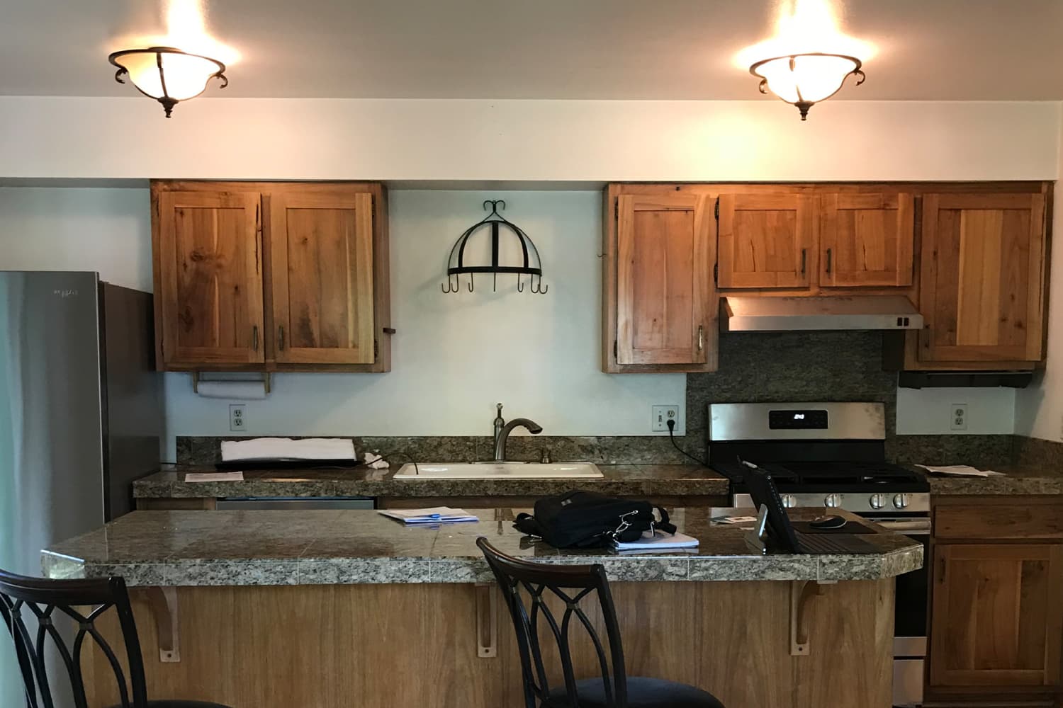 Less than a week later though, they decided the time was right to go all in on a full dream kitchen redo. “From a design standpoint, I wanted to create the look and feel of a high end, custom kitchen while operating out of a very realistic budget,” says Woodman. “An all-white kitchen felt a little bit overwhelming and one-dimensional for this house, as there are a lot of warm wood elements already in place throughout the rest of the home.” So stylistically speaking, the goal was to introduce some bright white, clean finishes, says Woodman, but keep them from looking too clinical with wooden touches “while also not veering into rustic territory with too much wood.” This aesthetic directive drove most of their fixture and finish decisions.