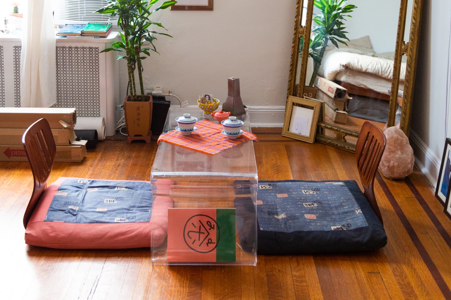 This time around, I opted for a low acrylic table paired with a set of Japanese floor chairs. I randomly found the table in the lobby of my former building while moving out of my last apartment, and I sourced the floor chairs in Hong Kong with my mom years before I moved to New York. I love the chair cushions so much that I actually flew cross-country with them from my mom’s home in Southern California. The chairs are sleek, well-designed, and surprisingly comfortable given they don’t have legs. They also remind me to maintain good posture while I’m using them. As someone deeply inspired by how people live around the world, I liked the idea of having my seating more grounded, like I’ve commonly seen outside the States.