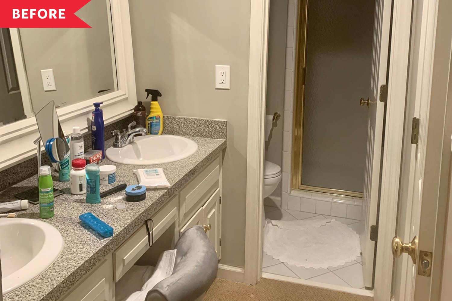 When Connie first moved into her home, she started by taking out the medicine cabinets, patching the walls, and replacing the mirror with a wide wooden-framed bevel mirror.