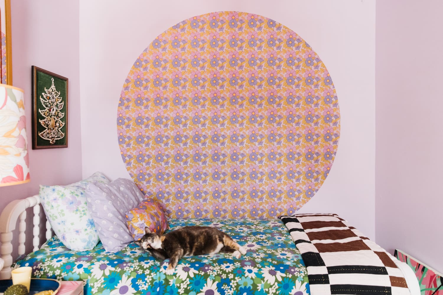 Why cover the whole wall with wallpaper when you can cut it out and make completely unique designs? Sue Liedke‘s Philadelphia home is full of ’70s-inspired decor, including this clever room accent made with floral peel-and-stick wallpaper. Throughout the home, there are seven different wallpaper prints, but Liedke says she “tried to use it in ways that don’t overwhelm you in the space.” Here’s to using wallpaper as art!