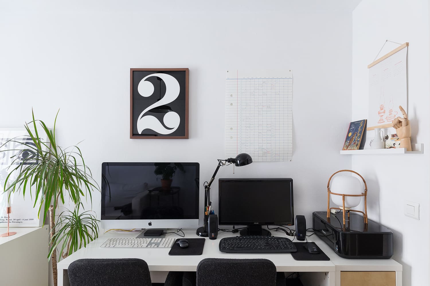 Heuck was really intentional about making this space fit her needs by ensuring its design made it feel like a communal space as opposed to a bedroom. This is proof that if you have an extra room — or just a smallish living area — you don’t have to sacrifice floorspace for a TV. Look to steal space where you can, and sometimes the best place to do that — sans heavy renovating — is just by taking the doors off of a closet and filing it with furniture.