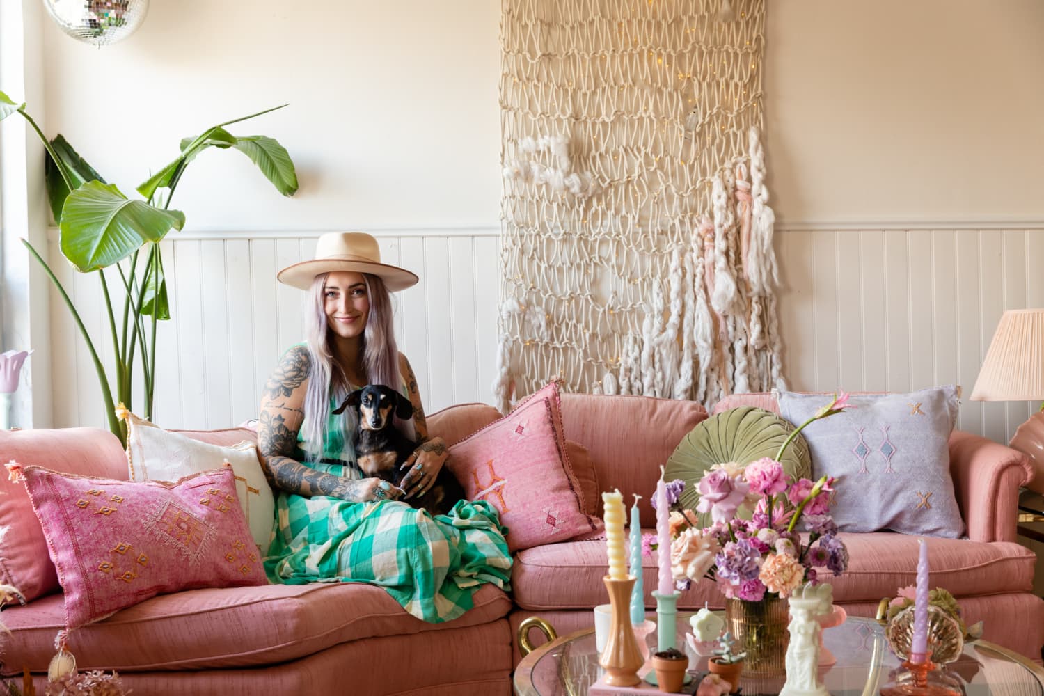 Along with caring for all of those plant babies, Luna continues to evolve their home’s style thanks to thrifting and collecting cool decor objects from small businesses. And she also spends a lot of time in their home on painting projects. “I’ve fallen in love with creating fun shapes and adding as much color as I possibly can.” And recently, her pastel palace has also been home base for her newest venture: making pastel soy wax candles for her new business Moonwix.