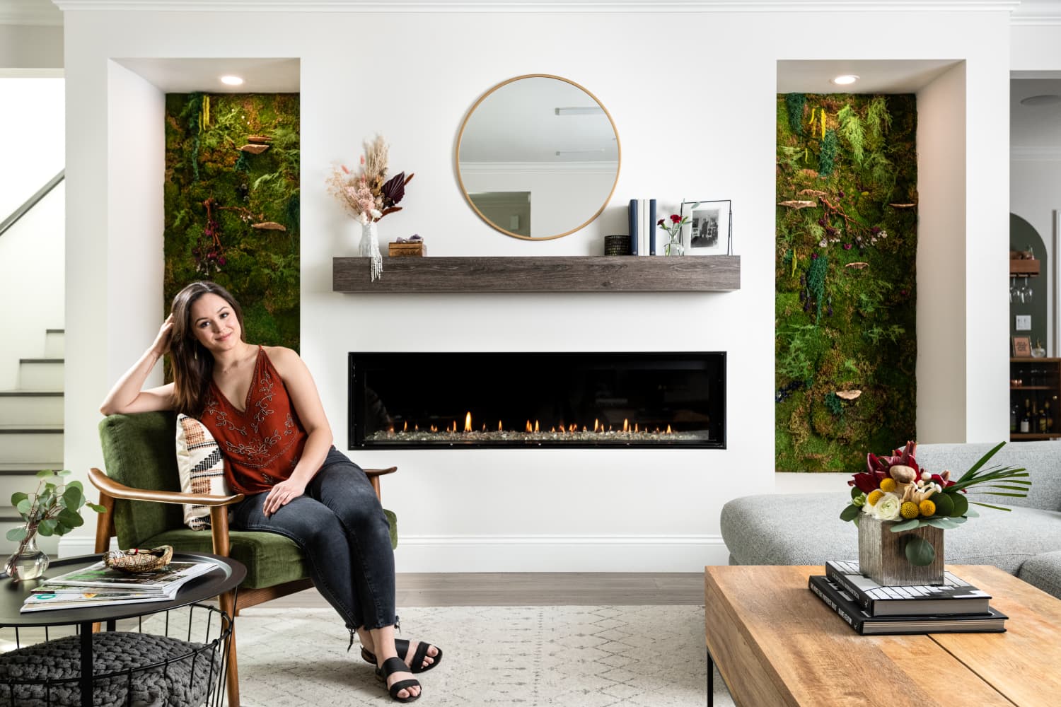 The home’s proximity to nature was also a huge win for the couple. “One of my favorite aspects of the property is this stunning mulberry tree in the backyard. Our covered deck feels more like a living room and leads straight out the tree, wrapped in lights. You feel like you enter a whole other place back there. It truly is magical.” The backyard isn’t the only way in which nature is highlighted; Hayley’s brought in nods to nature throughout the home’s design, from the moss-filled nooks on either side of the fireplace, to a gorgeous green painted arch behind the bar, to a rustic custom wooden art piece in the dining room. All elements that work together to achieve a space perfect for one of the couple’s favorite pastimes: hosting friends. “We’re just so glad we could curate a space that is warm and inviting for friends and family to come visit anytime!” she writes.