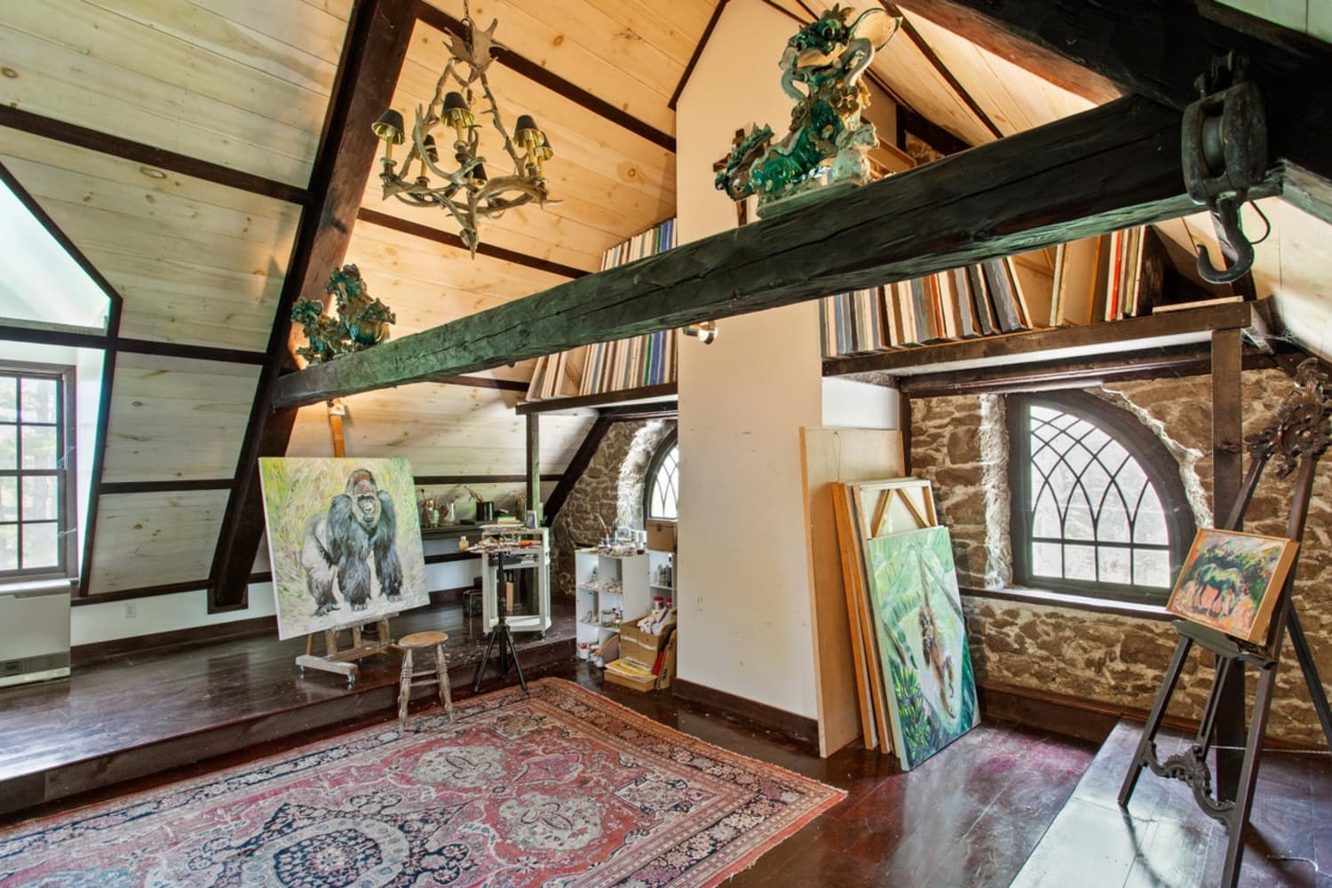 The miniature palace is set on a one-acre lot with stone walls, a fountain, statues, and perennial gardens, all surrounded by protected forestland and a private horse farm. Inside, the place is equally magical, with a grand wood-paneled sitting room, stained glass windows, beamed ceilings, and several fireplaces.