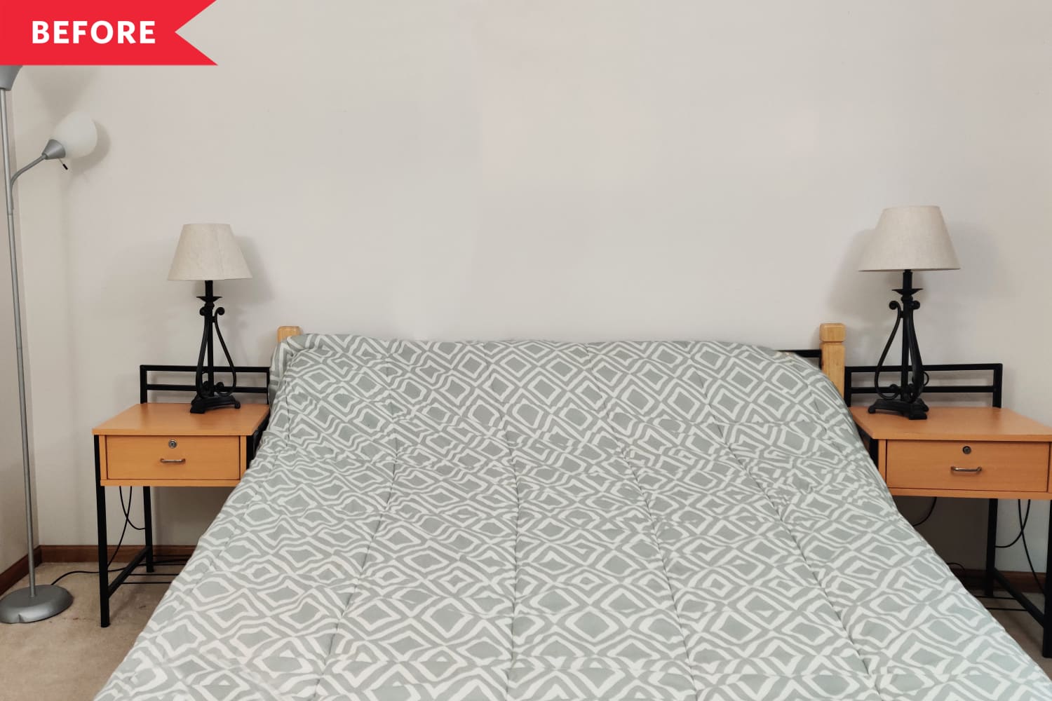 Loren Muntz had what she describes as a “dark and depressing” bedroom, complete with gray-green walls and old carpet. She dreamed of a place that felt more like a luxurious hotel room, and went about making it happen for about $4,000 over the course of six months. She painted the walls white, installed wood flooring, put in a new light fixture, and styled new furniture, but the biggest “wow” moment has to be the scalloped accent wall behind the bed. The happy wallpaper was a budget-friendly buy she spotted on Amazon.
