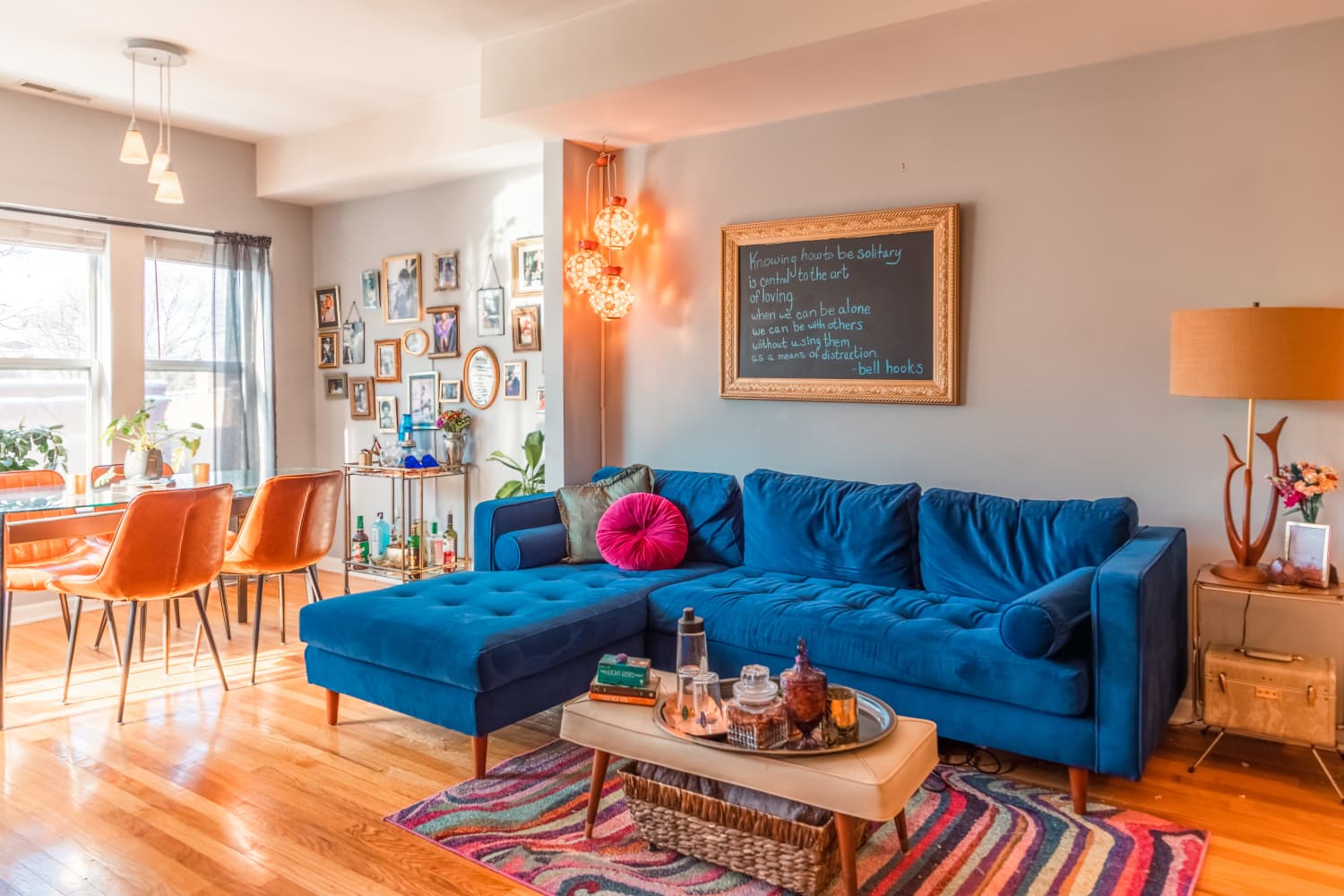 Proudest DIY: My proudest moment was when I found a large blue framed chalkboard for $5 at a thrift store. Since I wanted to hang it above my blue couch, I painted it gold. I like the idea of having artwork that I can change when I want to. I like to write quotes of Black feminist writers as my sources of inspiration. I also invite others who visit to leave a drawing, poem, or quote if they like.