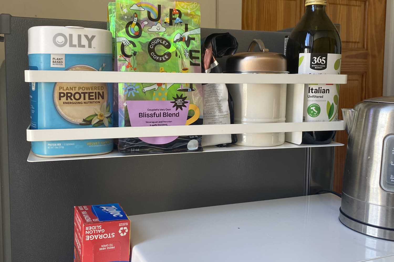 What I love about this organizer is that while my kitchen tends to look chaotic with various storage units and wall racks, this sleek white steel shelf doesn’t add to the noise. Instead, it looks clean and simple attached to my fridge, no matter what it’s holding. The primary use of this find has been clearing the space on top of my fridge, to make these items easier to reach and look less messy. Now, instead of being greeted with the clutter on top of the fridge as soon as you walk into my kitchen, it looks much neater because everything fits comfortably on this shelf.