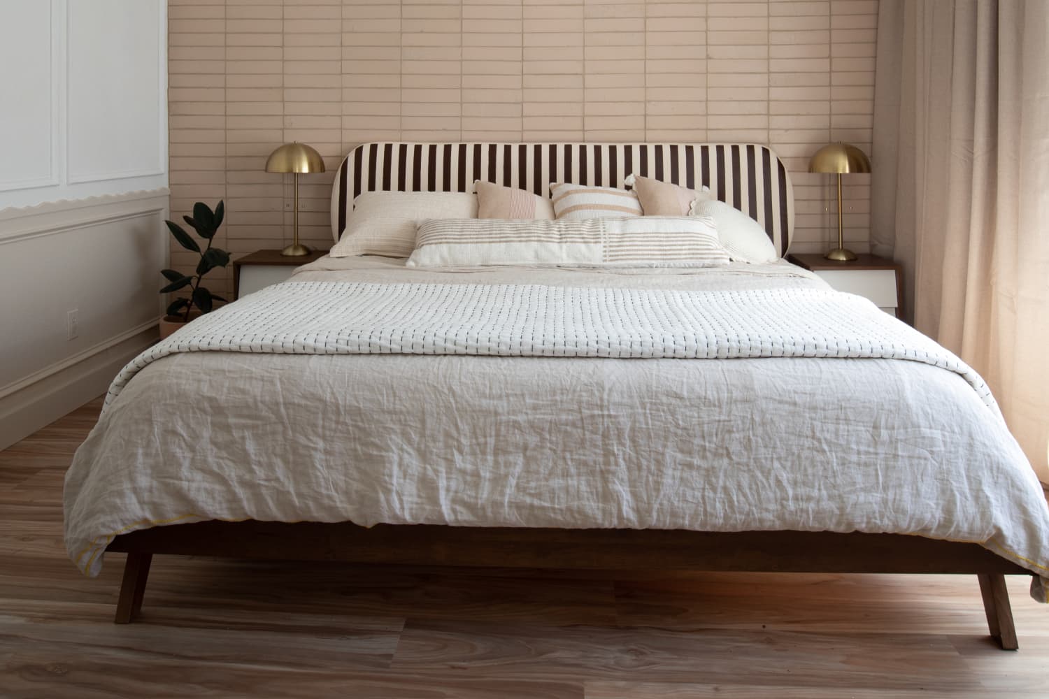 Of all rooms, the bedroom might be the most important place to think about how the space feels. Amanda knew she wanted hers to feel warm and serene, which is why her headboard’s cool gray tone didn’t work anymore. She decided on a grounding cream-and-brown color palette, with stripes to create visual interest and texture.