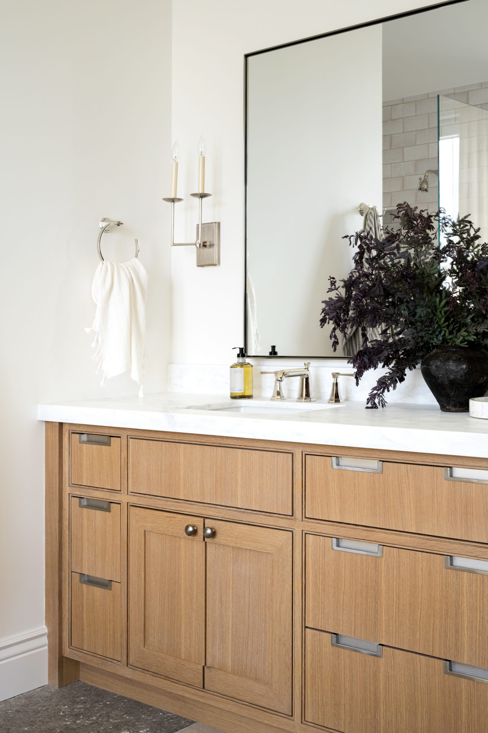 “Opting for one long mirror rather than two allowed for the sunshine to pour in from the windows of this space and maximize the natural light.”