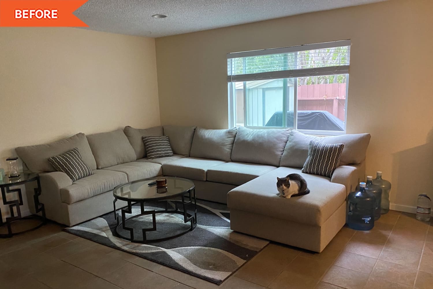 And while it was functional, the entire space was just different shades of brown and beige, and lacking any sort direction in regard to style. “It also felt very cold since there was no art on the walls and the sectional sofa was shoved into a corner of the room,” Rebecca says. In fact, all the walls in the living room were completely bare, expect for a tiny little shelf tucked off into the corner.