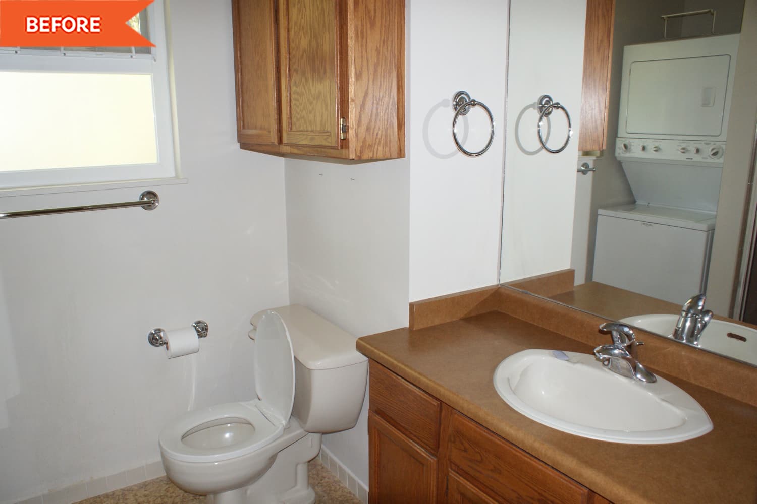 When trying to figure out the new layout, Lori knew that the washer and dryer had to be removed to allow for more space and a better, more functional bathroom. So after removing the laundry corner — placing it elsewhere in the home — she decided to move the toilet, too, and create a bigger space for the shower right next to the window.