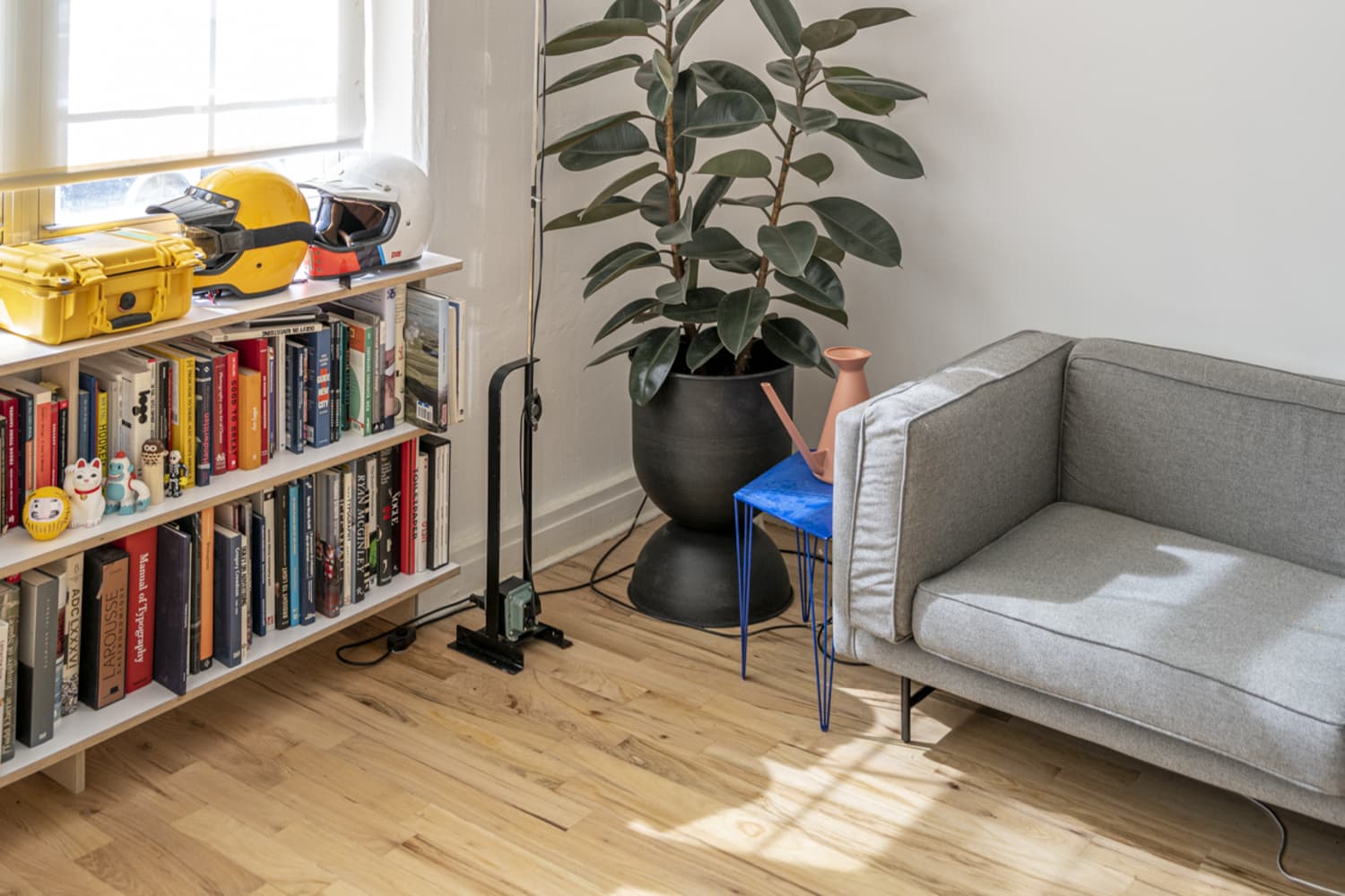 I’m a designer but I freelance sometimes as a product photographer so I wanted to keep the space uncluttered and modular in case I wanted to use it as a shooting space. I tried to use only colors and materials inspired by the materials/colors you can find in a photo studio: black, white, and wood (plywood birch).