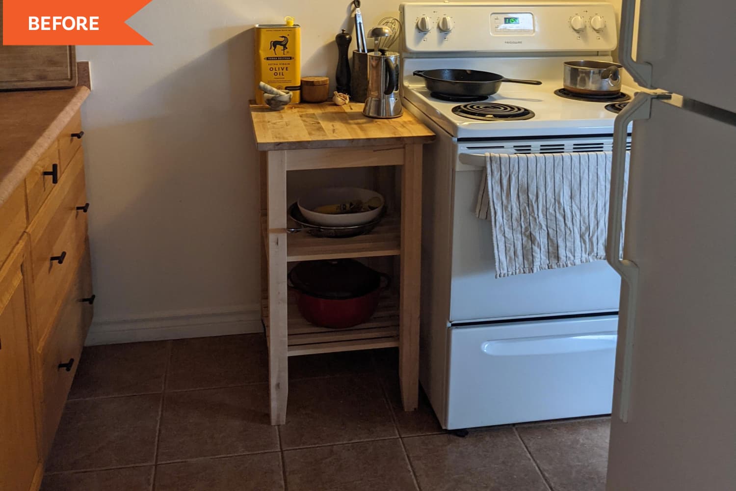 Orangey wood cabinets, beige walls, and basic laminate countertops are each hallmarks of a rental kitchen. And if you have all three, like Toronto-based renter Megan, that’s basically the jackpot. So it’s no wonder Megan called on home decor YouTuber Alexandra Gater (@alexandragater) for help in adding a little life to her cook space. Gater had recently put out the call that she and her team were hoping to help renters in Toronto overhaul their spaces for a transformational episode, and Megan’s kitchen turned out to be exactly what they had in mind.