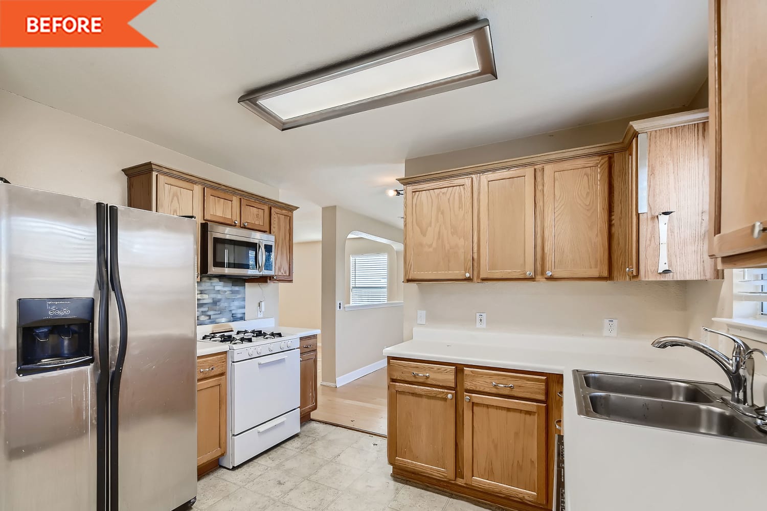 Layout aside, the kitchen wasn’t much to look at either. Beige vinyl floors, honey oak cabinets, light tan walls, and a clunky overhead fluorescent light all felt distinctly ’90s.