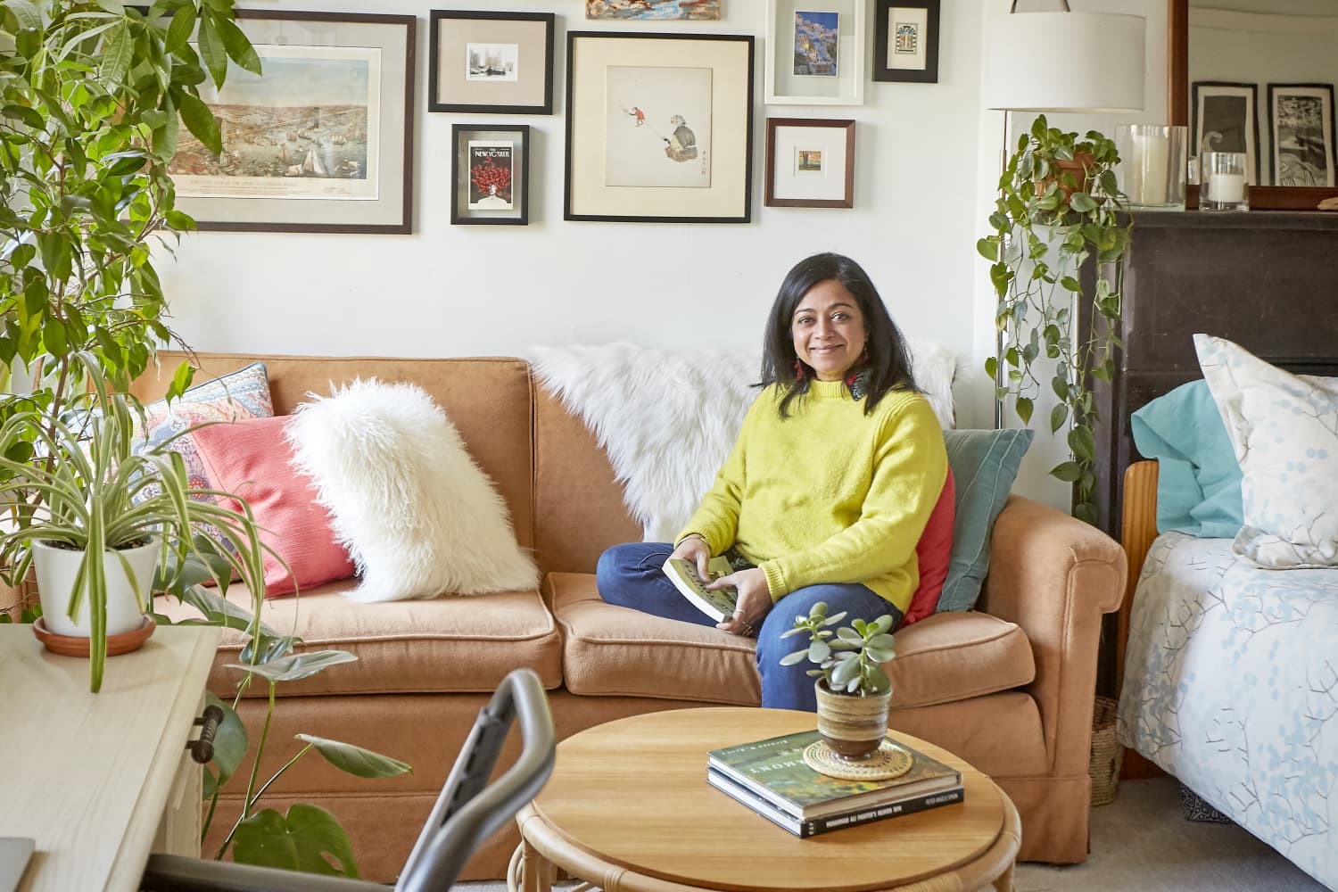 Darini has made this 240-square-foot Fort Greene studio apartment into a cozy, tidy home, a space she’s rented for almost two decades. “I’m an anthropologist and sociologist, who along with my students explore such topics as our consumption habits and the ways in which we could bridge our lives with the natural world in creative, cohesive, and environmentally sustainable ways,” explains Darini. “Living in a tiny space poses many challenges, such as the obvious limited space and storage options, so it’s taught me to enjoy living with less and by default also consuming less,” she writes. “My tiny apartment has taught me to keep clutter at bay and creating space for things that are functional yet provide an aesthetically pleasing environment.”