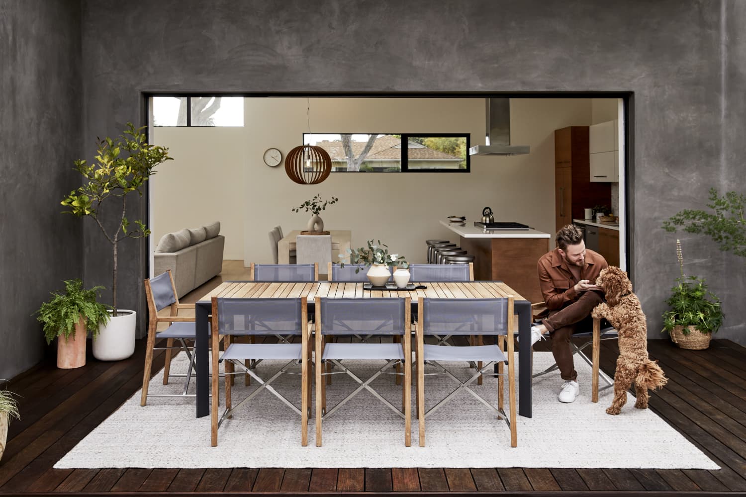 Bobby worked with Outer to design a versatile dining collection that is just as beautiful as anything made for indoors, but the pieces are able to hold their own against rain, sun, and more, all with Outer’s signature stylish flair, of course. The collab is centered on two of the most durable materials out there — teak and aluminum — and boasts super-smart features that add to its durability and flexibility. Let’s dive into the details, shall we?
