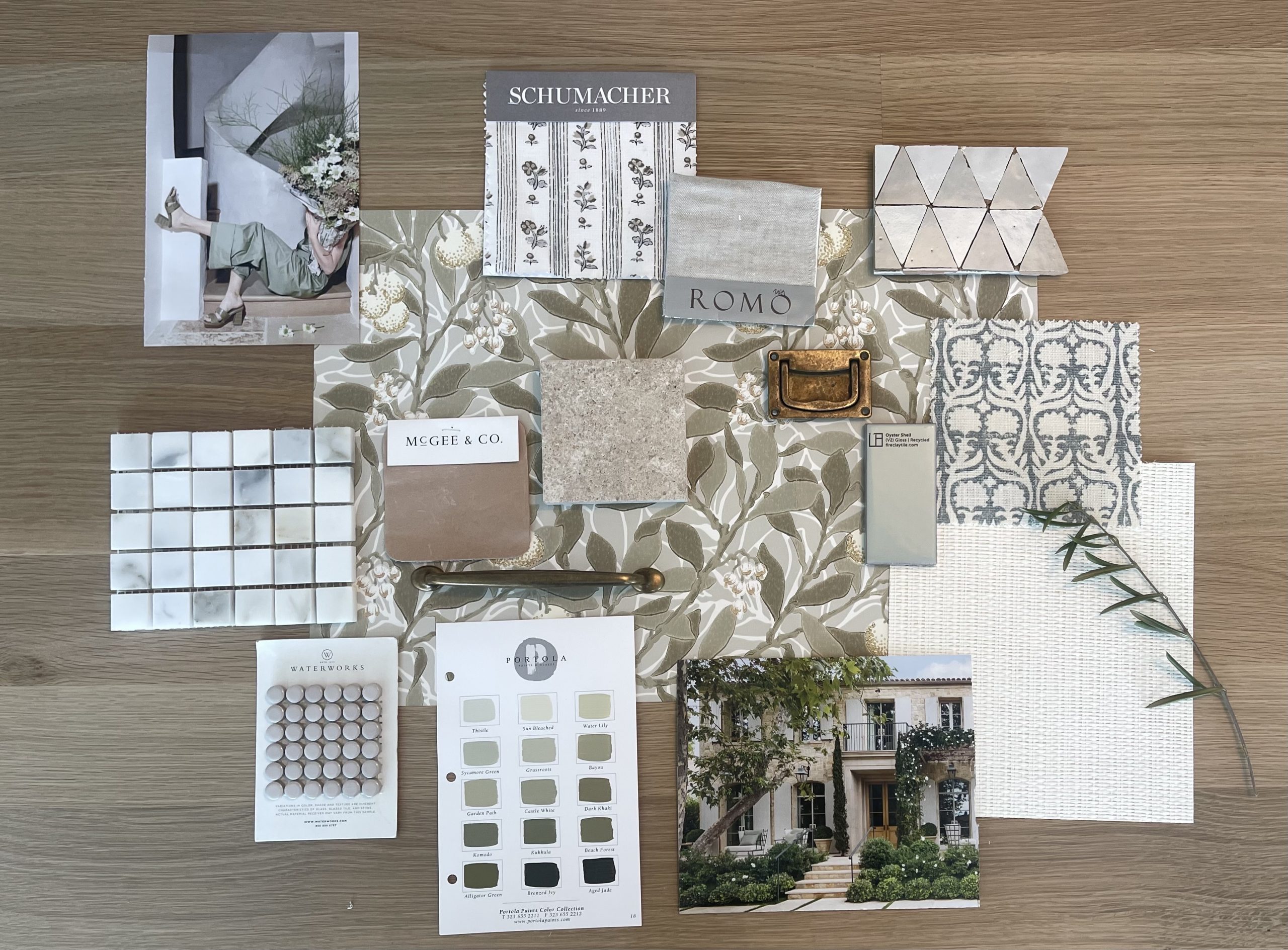 A dreamy, earthy palette sets the tone for our design team’s mood board, inspired by the feeling of romance that the onset of spring brings. Muted greens and warm greys are contrasted by the warmth of muddy terracotta and unlacquered brass, while botanical prints and hand-formed tiles add an element of nature’s hand. A whimsical floral pattern by Schumacher, a few paint tones we love from Portola, favorite swatches from our recent McGee & Co. collections, and an image we saved from the recent Freda Salvador catalogue pull the board together.
