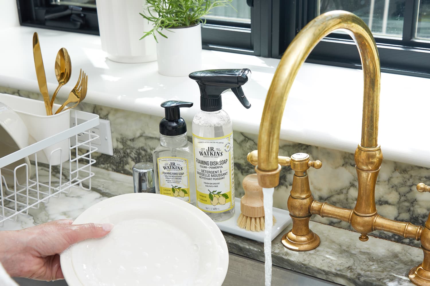 Over the years, I’ve bought a little bit of everything to incentivize myself and dress up my sink area: “cute” scrubbers, trendy soaps, fun dish towels, you name it. And yet, I. Still. Hate. Doing. The. Dishes. A few weeks ago, though, J.R. Watkins reached out to me about testing their first-ever dish soap. As a long-time fan of the plant-based brand’s hand soaps for their packaging, price, and practicality, I was intrigued and gave it a go. And, dare I say, it’s actually made cleaning dirty plates and pans a little more fun.