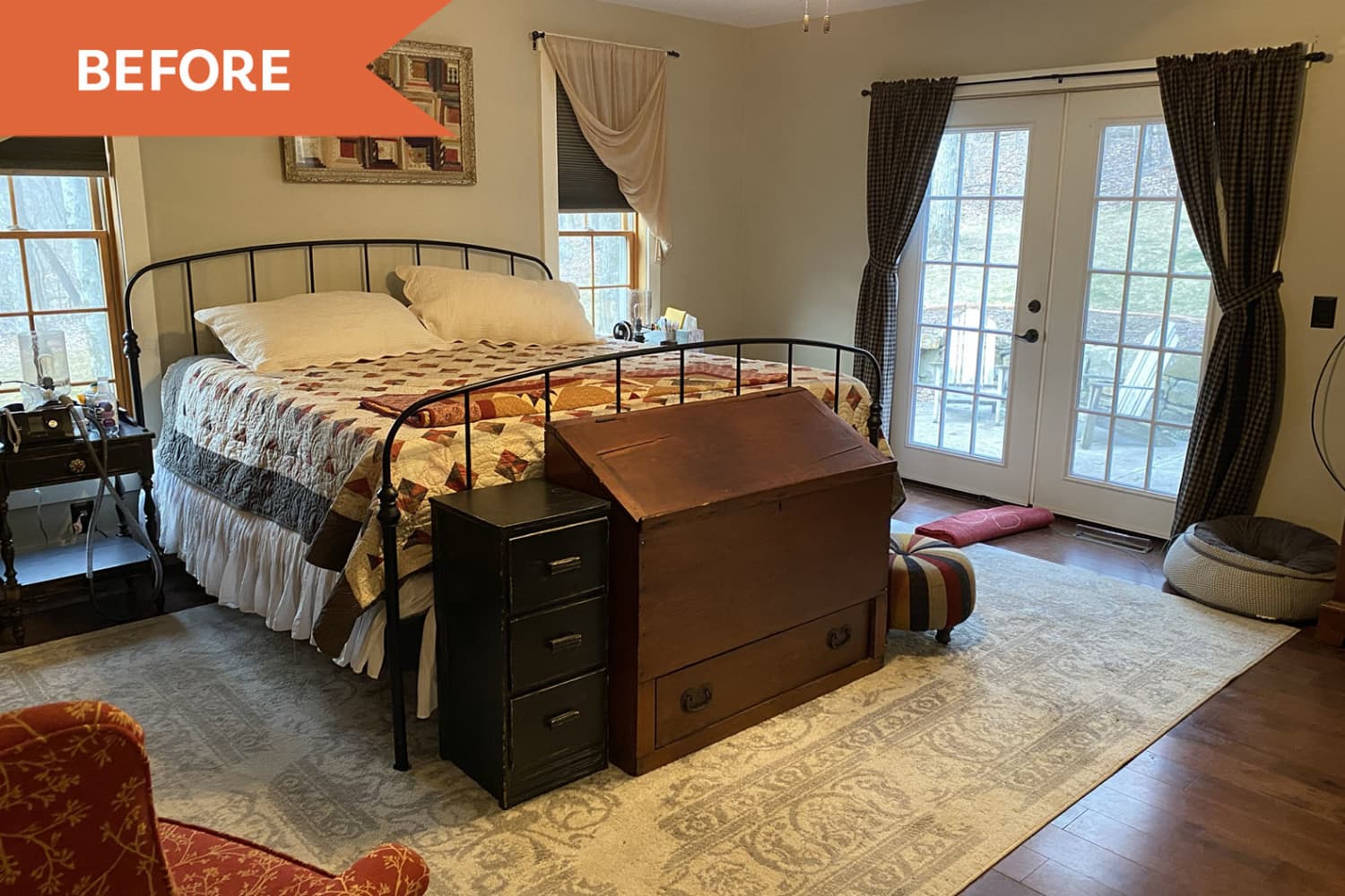 While leaving the furniture layout essentially in place, key changes made a big impact. She felt that the wrought iron bed was a good fit for the room, but she debated over the handmade quilt on top.