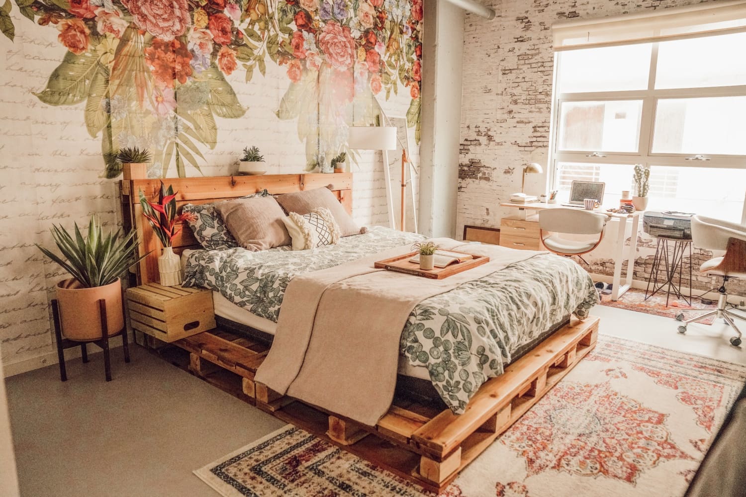 This inviting pallet bed from Anh of Girl and the Word is the key furniture piece that ties up the whole boho-inspired look in this industrial loft. The bare wood of the pallet bed helps lend warmth to the mostly white room, and ties together the floral accent wall with the room’s exposed brick.