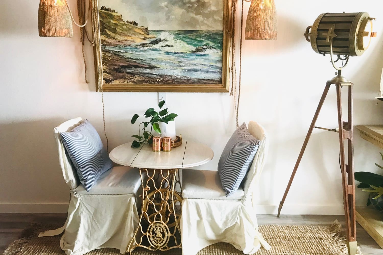 I have always been drawn to East Coast beach style. We were inspired by Nantucket for this home — hence why we dubbed it “The Grey Lady.” Of course we can’t afford any housing in Nantucket, but we wanted to bring the laid-back yet upscale coastal charm to our little getaway here in Oregon. We used lots of neutrals and naturals, marble and brass, and lots of plants to keep it really green and bright even on gloomy, blustery days — which we have a lot of at the coast. After we finished the design the whole “Coastal Grandmother” thing really kicked off so it is perfect timing because the space feels like a perfect representation of a Nancy Meyers heroine. We were on a tight budget, so a lot of items actually came from our personal homes, which I love, because we all had our contributions. The rest of the items came from Facebook Marketplace, Goodwill, and antique stores.