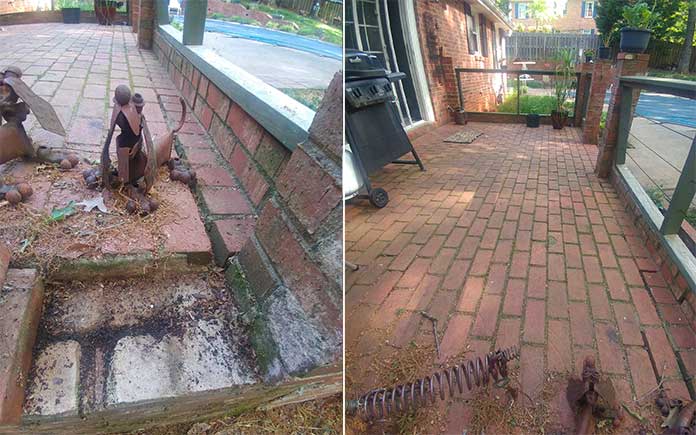 He says, “I have an aging brick paver patio, roughly 9 feet by 20 feet — there are some loose bricks and separating brick posts. It appears pavers are laid on a solid concrete base that is raised and brick-faced.”
