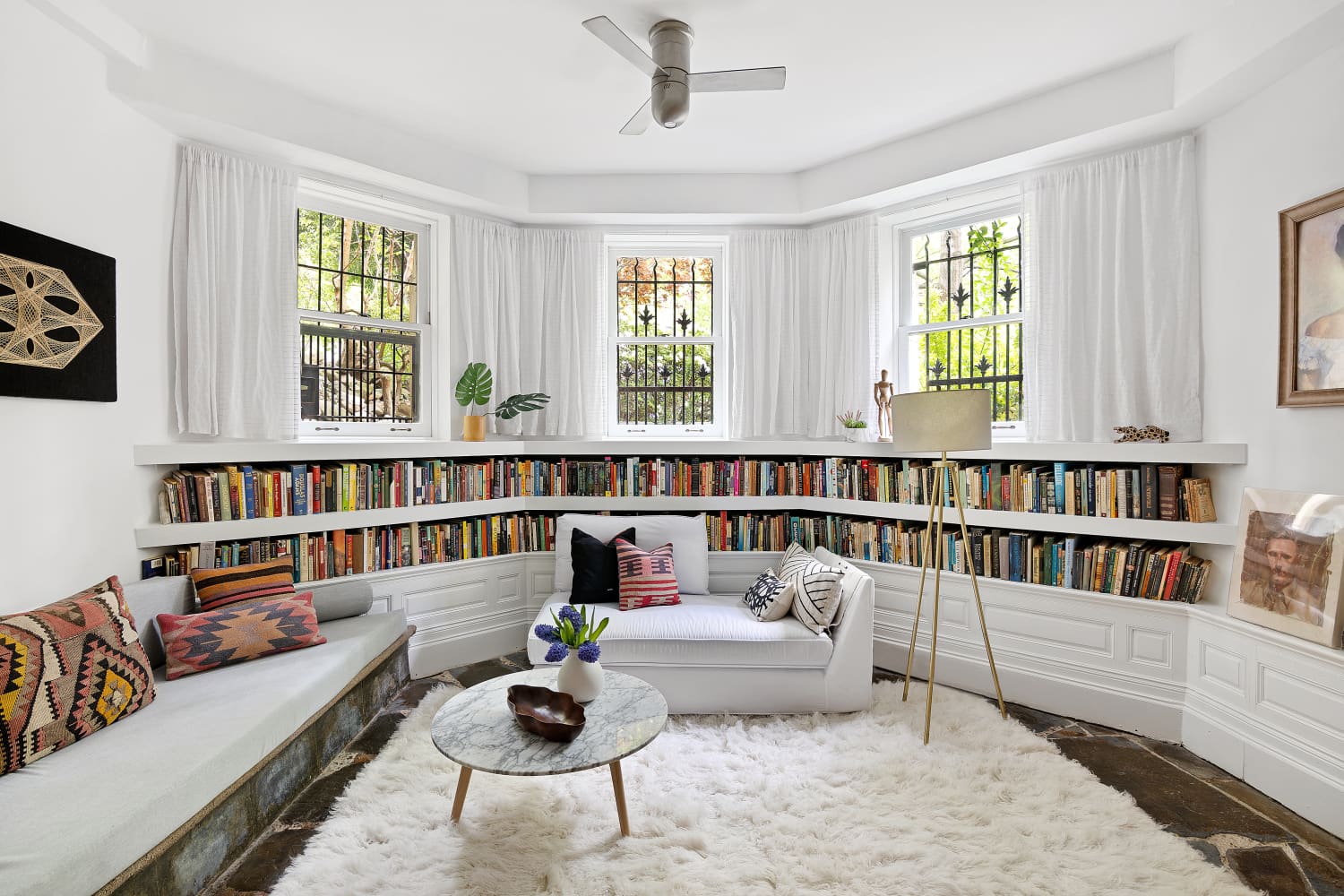 If you’re daydreaming of having a conversation pit — as I am ever since reading this story about how to create one in your own home — this Brooklyn co-op’s sunken living room will be a mood board come true. A stone floor, bench seating, and built-in bookshelves round out the lounge, illuminated by a triple bay window that peeks out onto the front garden.