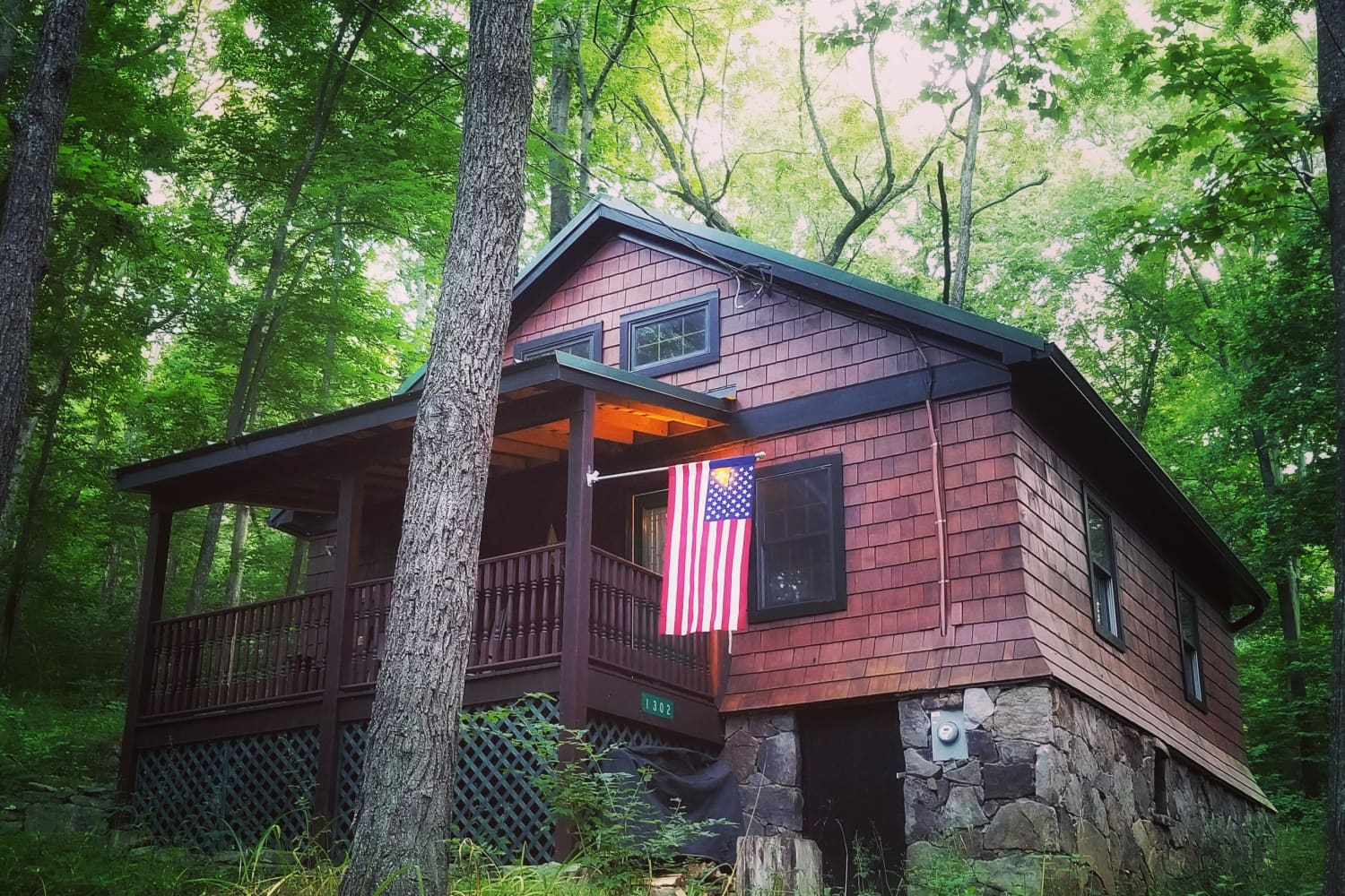 Tell us a little (or a lot) about your home and the people who live there: Our 1941 vacation cabin (“Knott Cabin”) is located on nearly three wooded acres. The front porch is faces east, so you get the morning sun coming up, and through the trees you can just see a glimmer of the Potomac River, which is less than 200 yards away. Inside is an open concept floor plan that includes the living room/bedroom/kitchenette/dining room. The hardwood floors are pine. An open staircase leads up to a loft with twin beds. A barn door conceals the bathroom, which has a very modern open shower with rainfall showerhead and heated tile floor.