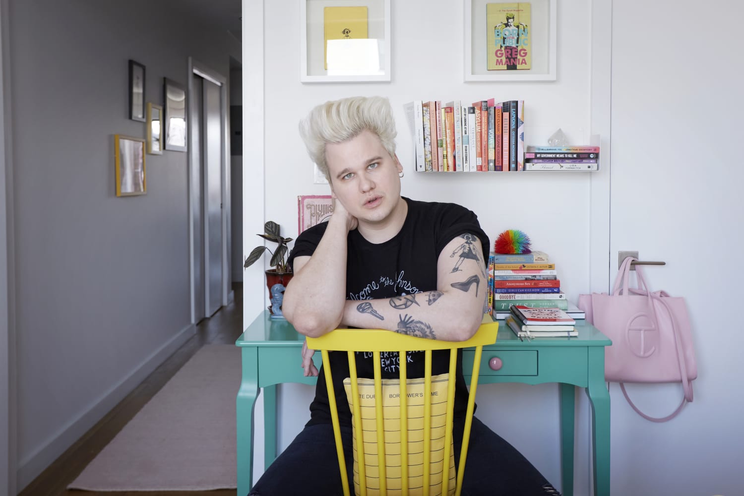 “I’m a queer writer, known for my flamboyant style, and my home is a reverberation of that,” explains New York-based writer, comedian, and award-winning screenwriter Greg Mania of the 700-square-foot apartment he rents in Brooklyn. “From the pops of pink, undercurrents of teal, and a generous dose of yellow (my favorite color), this apartment is inspired by the color palette of the cover of my first book, ‘Born to Be Public.’ It’s both chic and punk — a technicolor euphoria impossible not to feel at home at.”