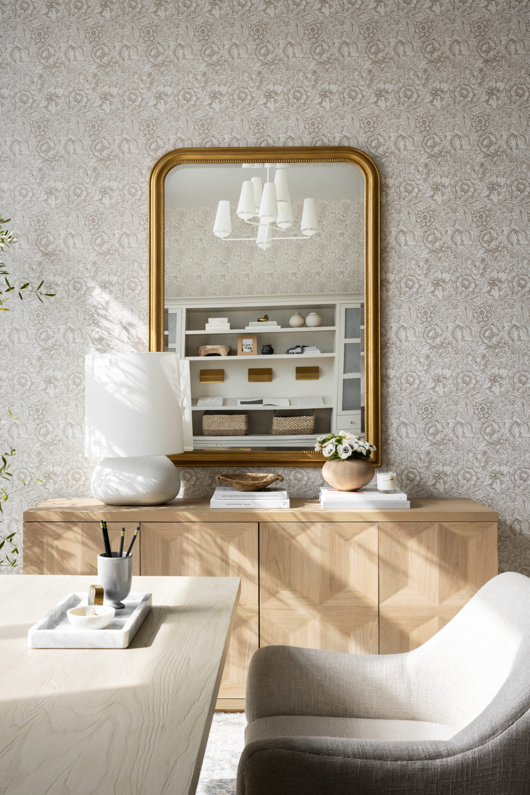 Next to Syd’s office (though not through an adjoining door!) sits Shea’s office. It’s the perfect mix of modern and traditional — blending feminine textures with modern shapes. One of the first details you’ll notice is the wallpaper wrapped throughout. Shea picked this specific wallpaper because although it has a busy pattern, the palette is neutral and a perfect backdrop to build upon.