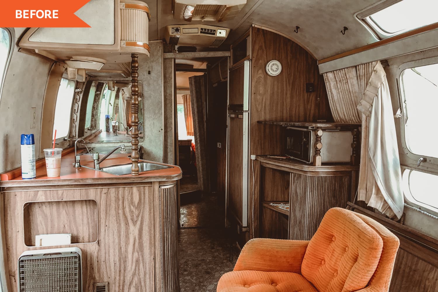 We live, work, and travel the U.S. in our completely renovated 31-foot 1977 Airstream Sovereign. The Airstream was originally left to rot away at a storage facility in a muddy field in Tennessee. It sat for years, slowly being consumed by the earth. We rescued and completely renovated it from the ground up with help from my parents’ Airstream shop, NuAbode. The only thing that’s original on it is the outer shell, the frame, the interior walls, and the windows. Everything else was gutted and rebuilt — including the original orange shag carpeting, which I’m sure was pretty rad back in its glory days in the ’70s.