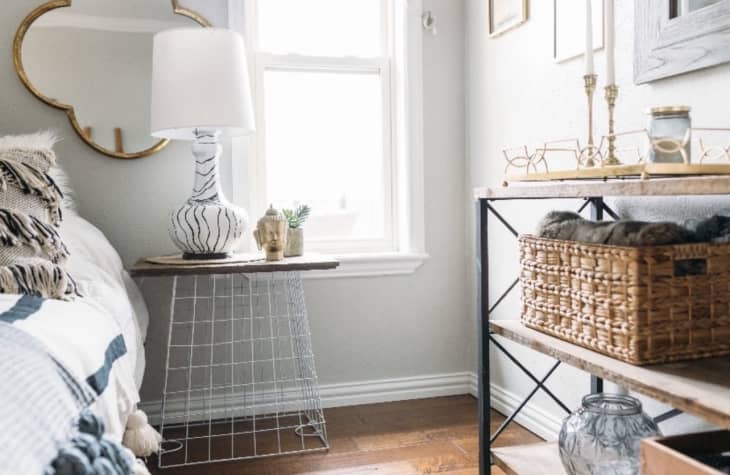 Believe it or not, Teresinski’s nightstands are comprised of two basic household essentials: a laundry hamper and a cutting board! For this project, simply flip a wire laundry basket upside down and attach a cutting board to its base, which turns it into the perfect surface for water, a book, or lip balm.
