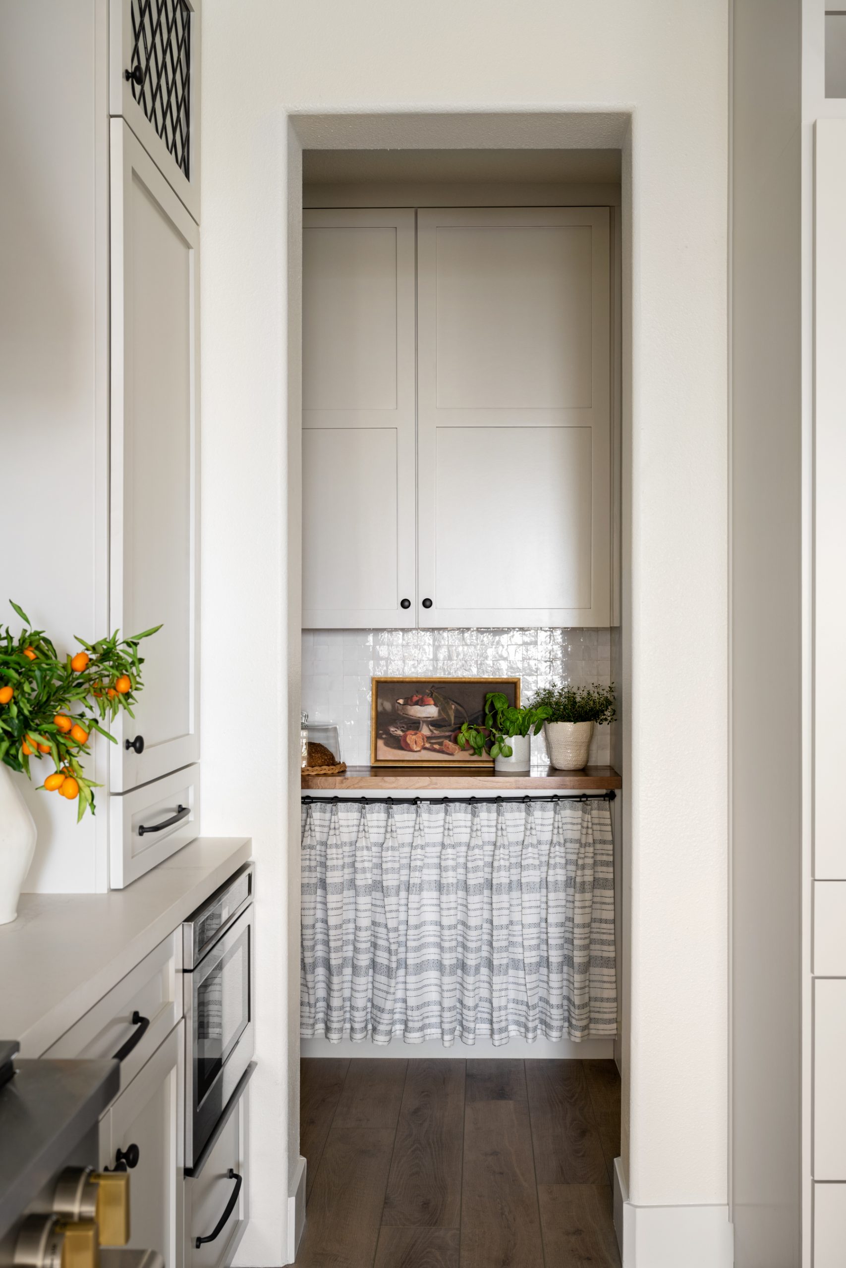 “The places that are visible, on the lower shelves, I always want to put things that are functional, but also really beautiful — like glasses, canisters, cake stands, and pitchers.”