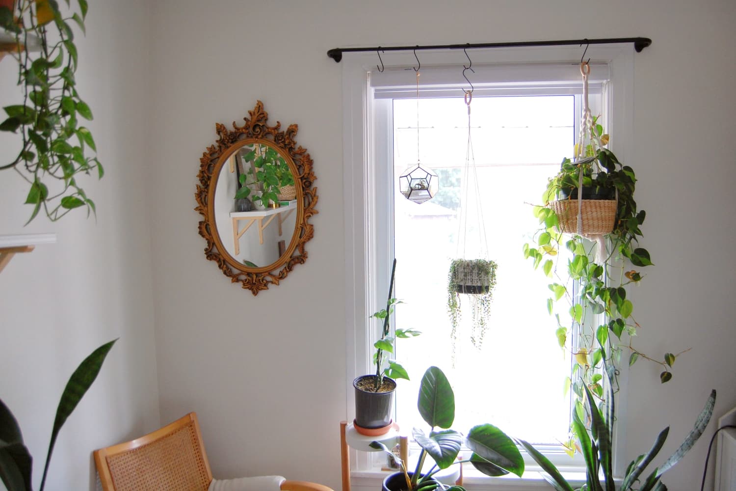 If your landlord is a real stickler and installing a traditional curtain rod isn’t even an option? Not a problem! A tension rod makes a fantastic alternative. Depending on the depth of your windows and the strength of the tension rod, you may need to choose smaller hanging plants if you go with this option, but it will still get the job done.