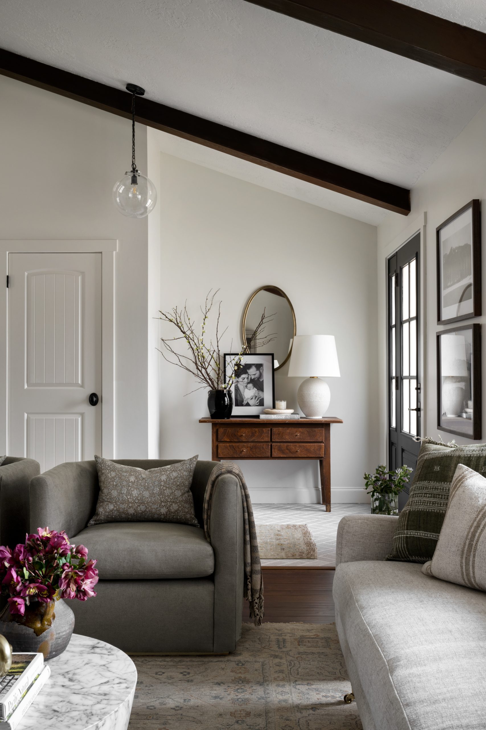 Tying this open-concept layout together, the existing beams and floors span across each area. We kept their dark wood stain to contrast with refreshed lighter walls, and brought in antiques and textiles that add a complementary character.